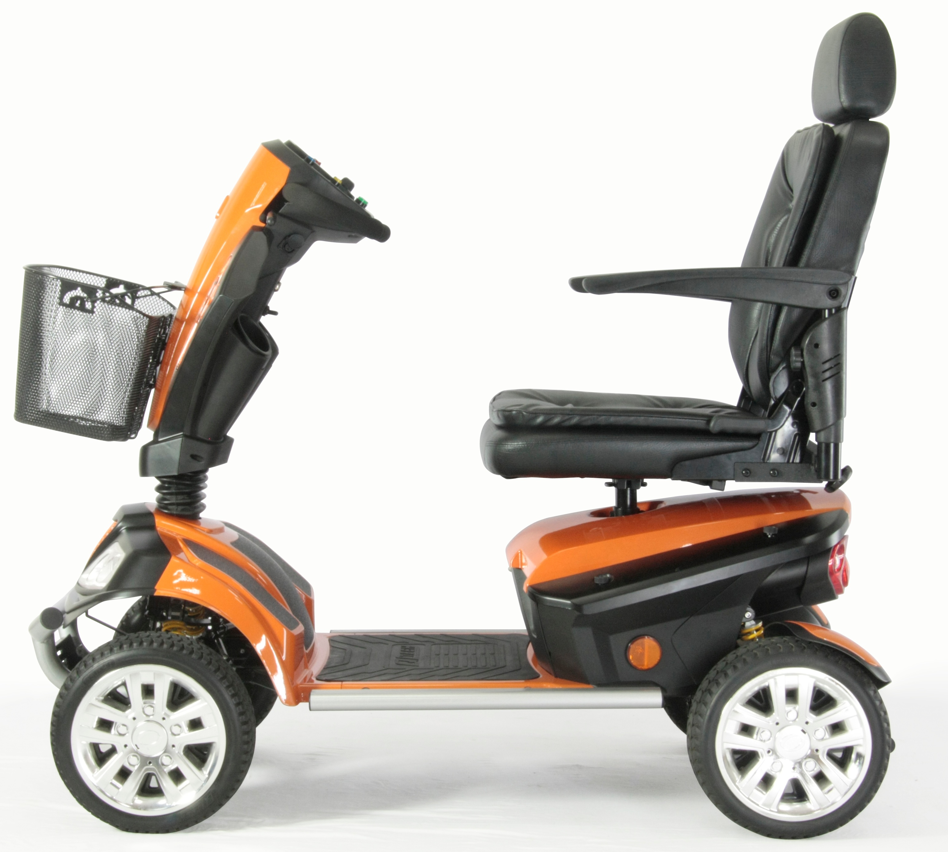 QS1343, a four-wheel scooter, provides an impressive blend of rugged outdoor maneuverability while giving a smooth, comfortable ride over a variety of nature’s most challenging terrains. QS1343 includes a standard front basket, two headlights and an extra roomy seat with an adjustable headrest for maximum comfort when on the go. With a 350 lb. weight capacity, 13” pneumatic tires, up to 30.4-mile operating range on optional 75 AH batteries.