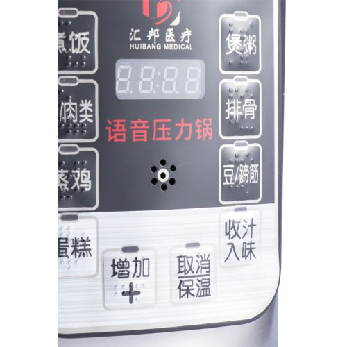 每一個(gè)操作按鍵都具有語(yǔ)音報(bào)讀功能,以及盲文點(diǎn)標(biāo)識(shí)和LED指示燈;具有LED四位數(shù)碼顯示屏,可顯示時(shí)間信息;材質(zhì):不銹鋼外殼,不銹鋼蓋子,食品級(jí)塑料蓋子防護(hù),鋁合金內(nèi)膽;具有一鍵式功能選擇鍵:具有煮飯、煲粥、魚/內(nèi)類、排骨、蒸雞、豆/蹄筋、蛋糕、收汁入味八種功能可選擇。