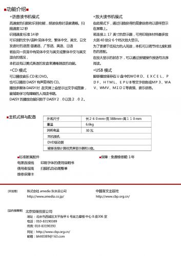 1. 語音閱讀模式:把掃描讀入的文章數(shù)據(jù)以優(yōu)雅易聽的語音讀出。 2. 放大閱讀模式(助視器功能):把掃描讀入的圖像數(shù)據(jù)在屏幕上放大顯示,最大放大倍率40倍(17寸顯示器), 6級(jí)放大顯示;可調(diào)整對(duì)比度和顏色;同時(shí)也可以使用操作鍵進(jìn)行語音讀出。 3. CD模式:可以播放CD/DVD/Daisy光盤(Daisy2.0及2.02)。 4. USB模式:可以播放U盤中的Word、Excel、Pdf、Htm