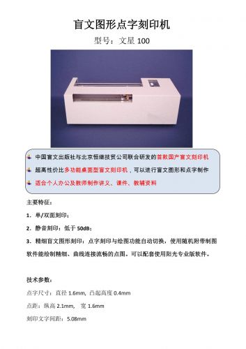 1.可刻印點字和各種圖表和點圖,雙面刻印。 2.刻印以及其他機械結(jié)構(gòu)設(shè)計合理,刻印的曲線圓滑連續(xù)性好,應(yīng)變性強。 3.刻印頭等機械結(jié)構(gòu)精巧可靠,設(shè)備的故障率低,靜音刻印,刻印噪音與同類產(chǎn)品相比最小。 4.輕便,操作簡單,易于掌握