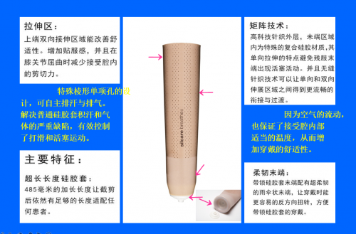 "擁有專利技術的排汗硅膠套,革命性地解決了用戶使用假肢的出汗帶來的體驗問題; 小腿截肢使用 ; 矩陣式分布的激光精密加工小孔,可主動排出空氣和水分 ; 無縫雙向拉伸,外形美觀的同時倍感舒適 ; 基于柔性技術的表面處理,可改善皮膚接觸剪應力 ; 單向氣閥的使用,實現(xiàn)與殘肢的完美貼合與運動跟隨性;"