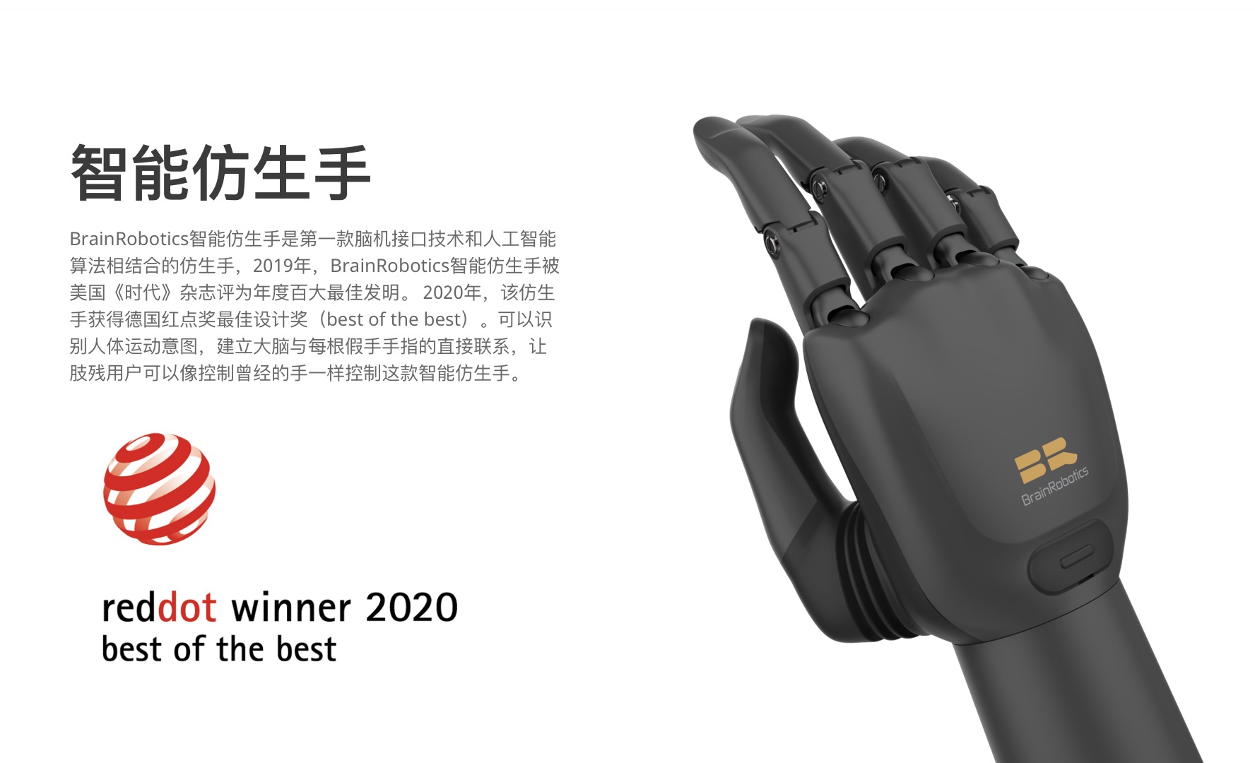 這是第一款腦機(jī)接口技術(shù)和人工智能算法相結(jié)合的仿生手,2019年,BrainRobotics智能仿生手被美國《時(shí)代》雜志評為年度百大最佳發(fā)明。 2020年,該仿生手獲得德國紅點(diǎn)獎最佳設(shè)計(jì)獎(best of the best)。可以識別人體運(yùn)動意圖,建立大腦與每根假手手指的直接聯(lián)系,讓肢殘用戶可以像控制曾經(jīng)的手一樣控制這款智能仿生手。