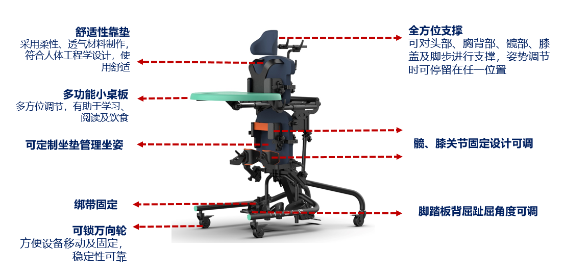 適用人群:腦癱、SMA、脊髓損傷及外傷等原因?qū)е碌能|干及四肢功能較弱的患者 產(chǎn)品特色: 1、坐立位、站立位、仰臥位自由切換 2、多維度可調(diào)適,多配件可選擇 3、專業(yè)輔具適配及售后,個(gè)性化康復(fù)指導(dǎo)