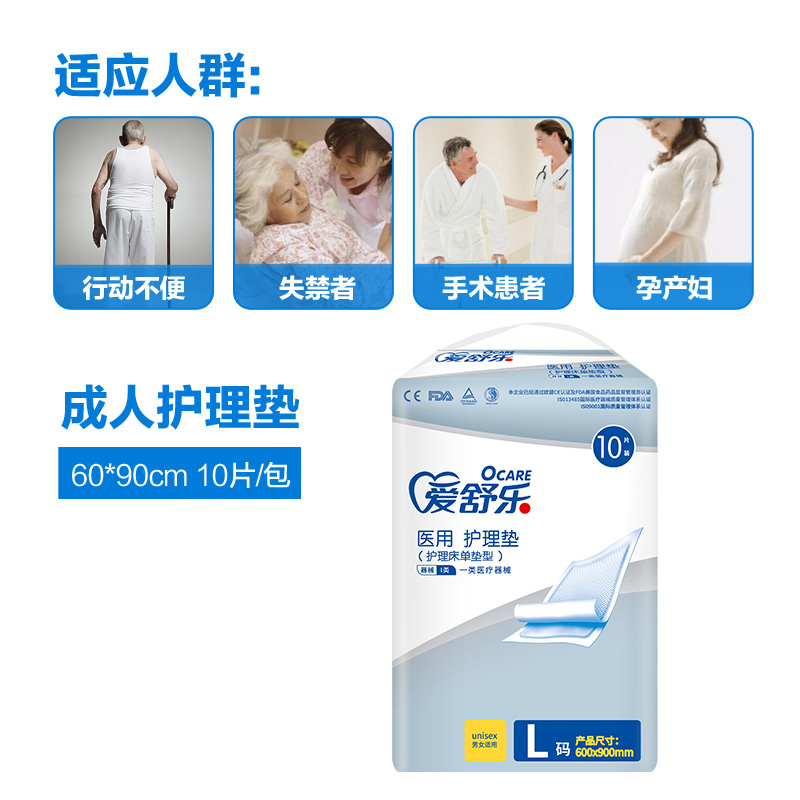 60*90大面積,呵護更周全,使用者安心入睡,照護者減少床鋪換洗工作 舒柔無紡布表層,親膚無刺激,耐用不起球 強力吸收體:加厚棉芯+倍效速吸高分子,強力吸收,有效鎖水,不反滲更安心