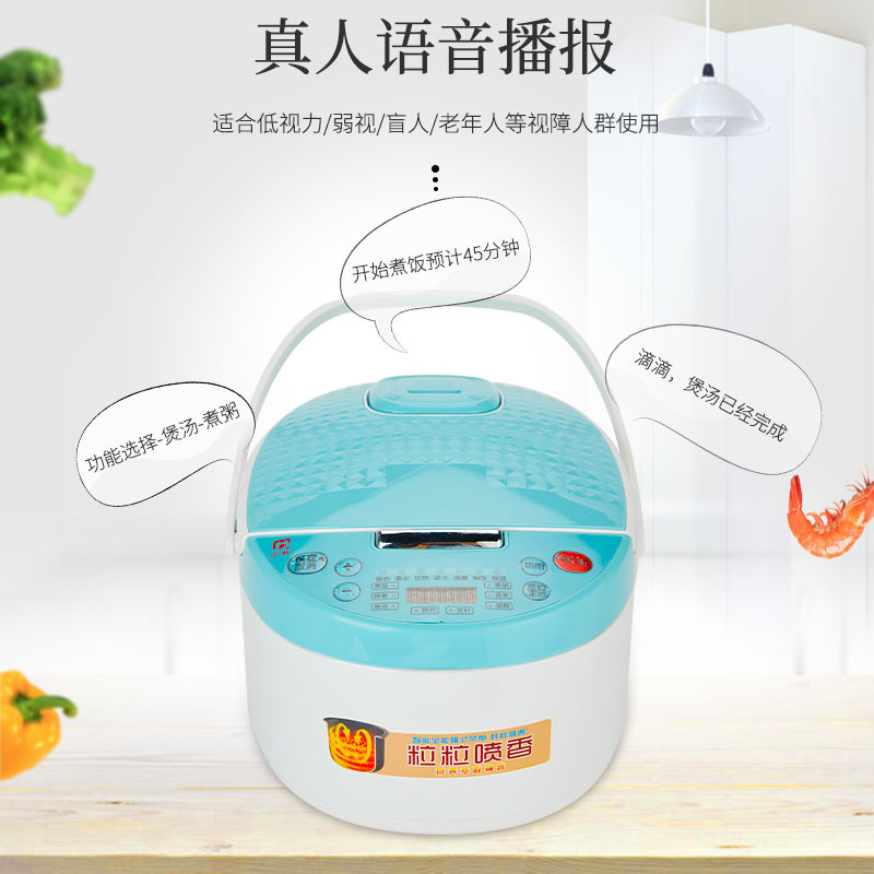 具有全程語音提示功能;精煮、快煮、煲湯、煮粥、蒸煮、蛋糕、保溫、預(yù)約/定時八大功能,并且都由獨立按鍵控制;功能按鈕帶盲點標識及LED指示燈;烹飪完成后語音播報“烹飪結(jié)束”并進入保溫模式,保溫模式下,按下任何按鍵播報之前的“烹飪功能及烹飪結(jié)束”語音;具有顯示屏:一個LED四位數(shù)碼顯示屏可顯示預(yù)約定時信息,另一個顯示屏可顯示精煮的7段過程:預(yù)熱、吸水、加熱、吸水、沸騰、燜飯、保濕。