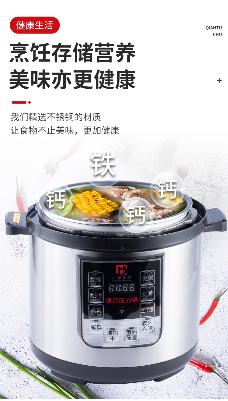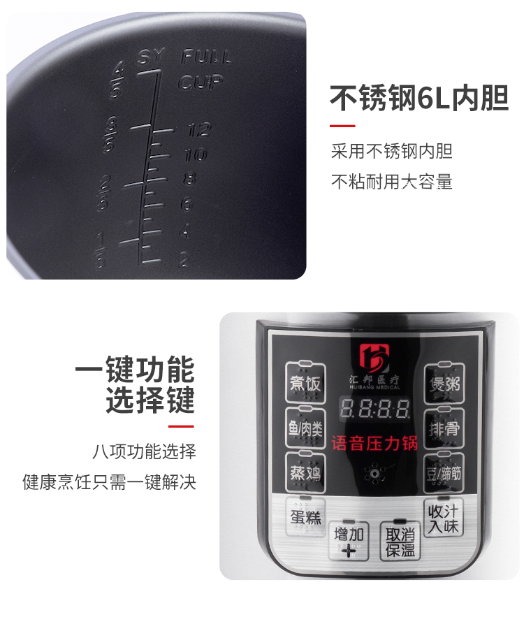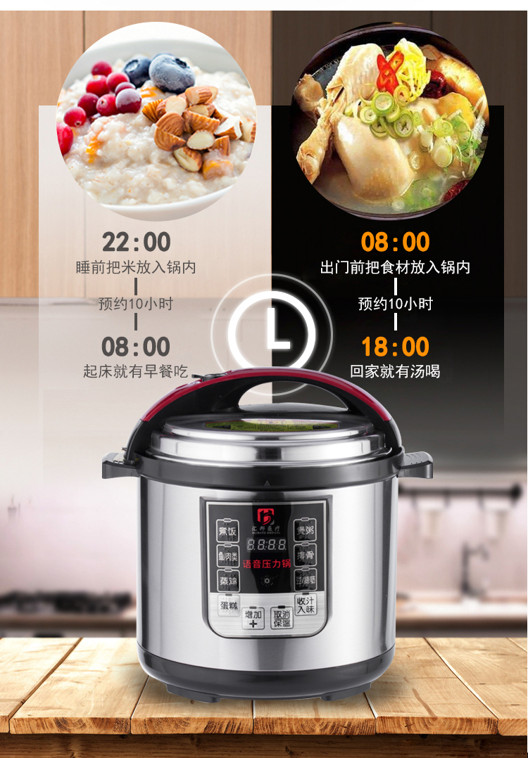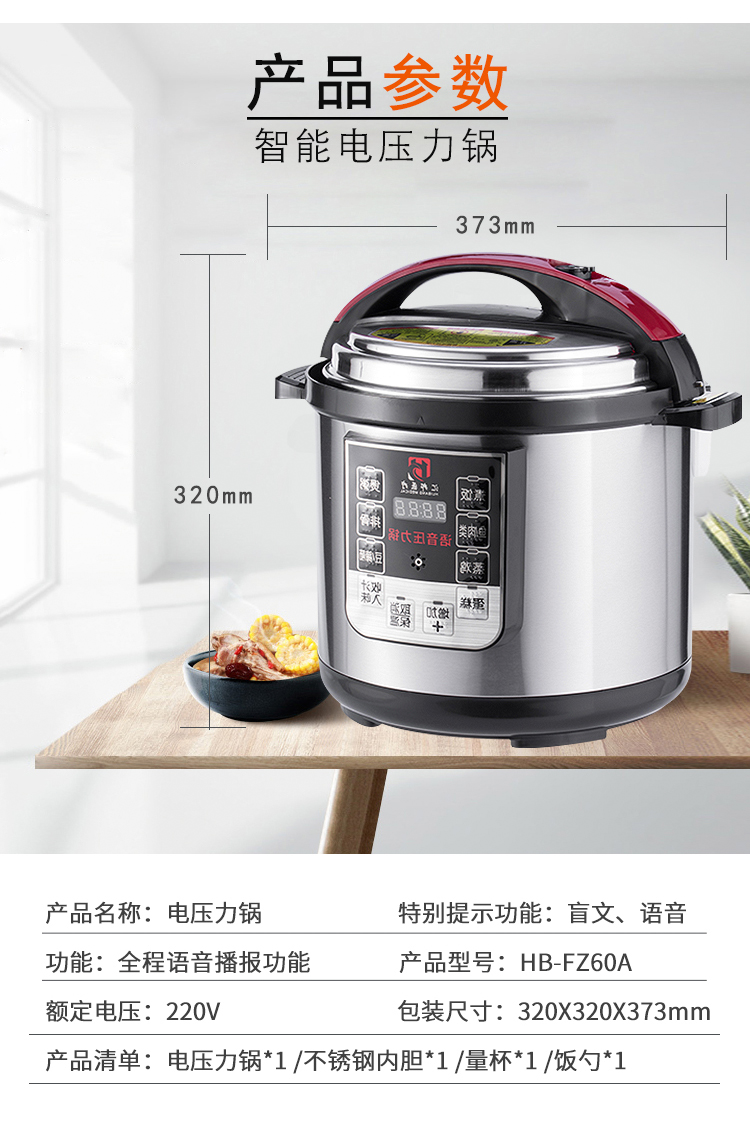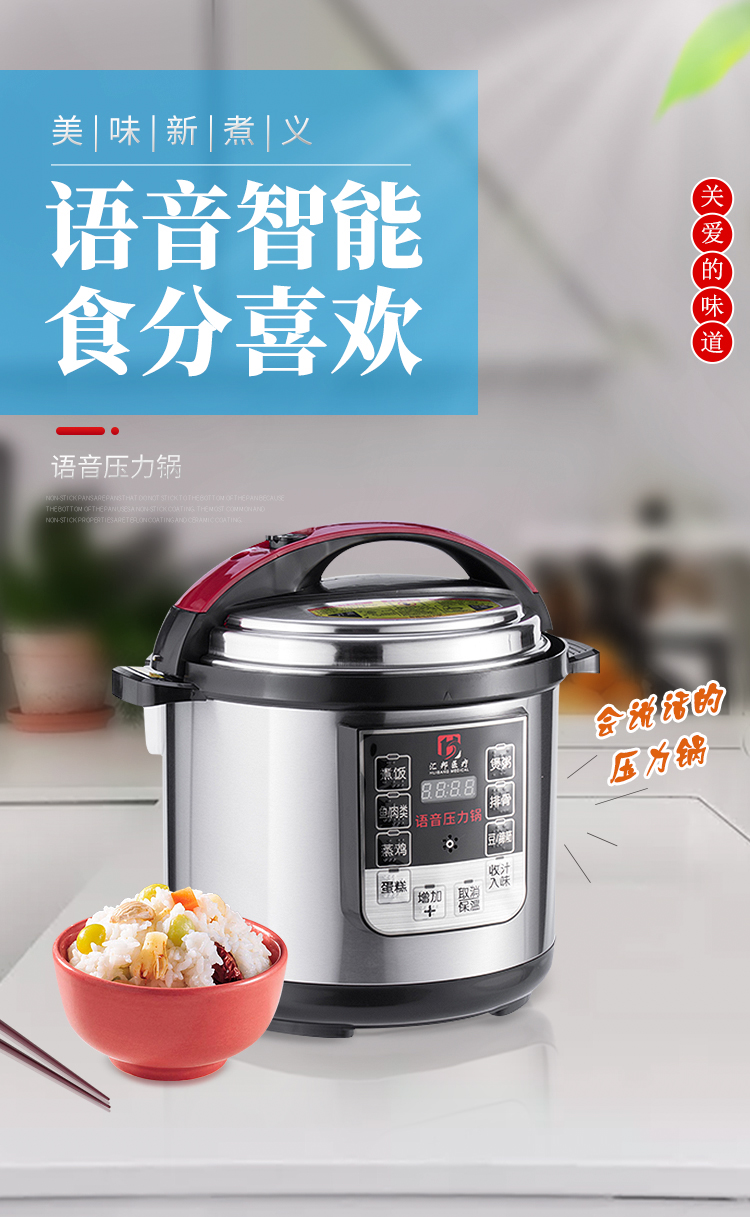 每一個(gè)操作按鍵都具有語音報(bào)讀功能,以及盲文點(diǎn)標(biāo)識和LED指示燈;具有LED四位數(shù)碼顯示屏,可顯示時(shí)間信息;材質(zhì):不銹鋼外殼,不銹鋼蓋子,食品級塑料蓋子防護(hù),鋁合金內(nèi)膽;具有一鍵式功能選擇鍵:具有煮飯、煲粥、魚/內(nèi)類、排骨、蒸雞、豆/蹄筋、蛋糕、收汁入味八種功能可選擇。