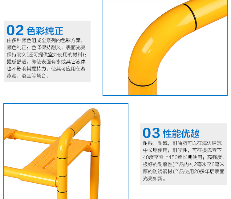 采用4mm厚度的高品質(zhì)德國尼龍材料,內(nèi)襯采用304不銹鋼管或優(yōu)質(zhì)鋁合金組成;有抗菌、防火、耐磨、耐酸、耐堿、耐油脂及防滑等性能;表面有防滑浮點,產(chǎn)品是能達到食品級的環(huán)保材料;有抗沖擊型,產(chǎn)品表面撞擊后不會像金屬管材產(chǎn)生凹痕,不會有任何傷痕;有耐溫性,可以在攝氏零下四十度到零上五十度中長期使用,可為客戶提供配色服務(wù),色彩多樣,整潔美觀,使墻面充滿活力,保養(yǎng)方便、持久耐用。