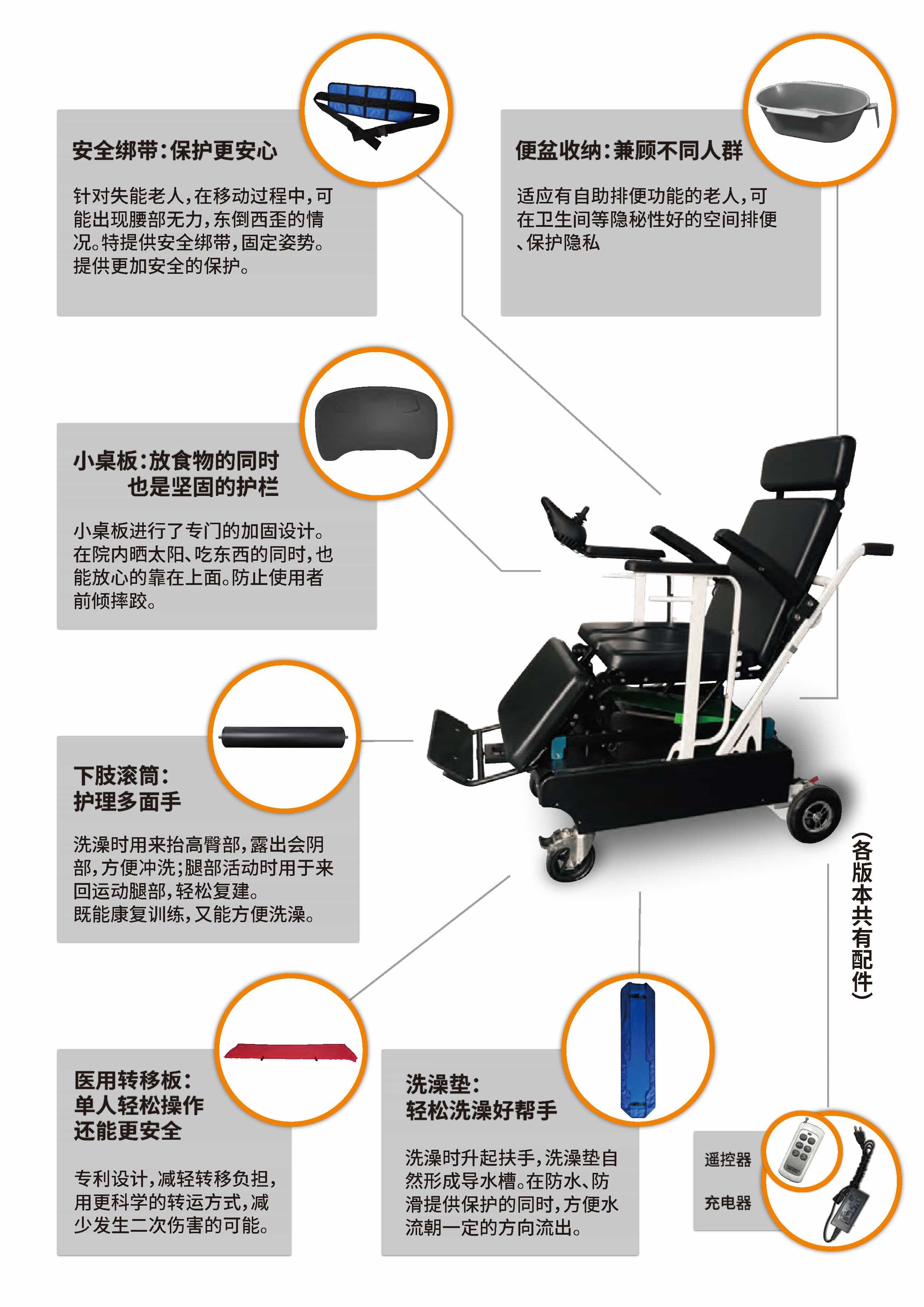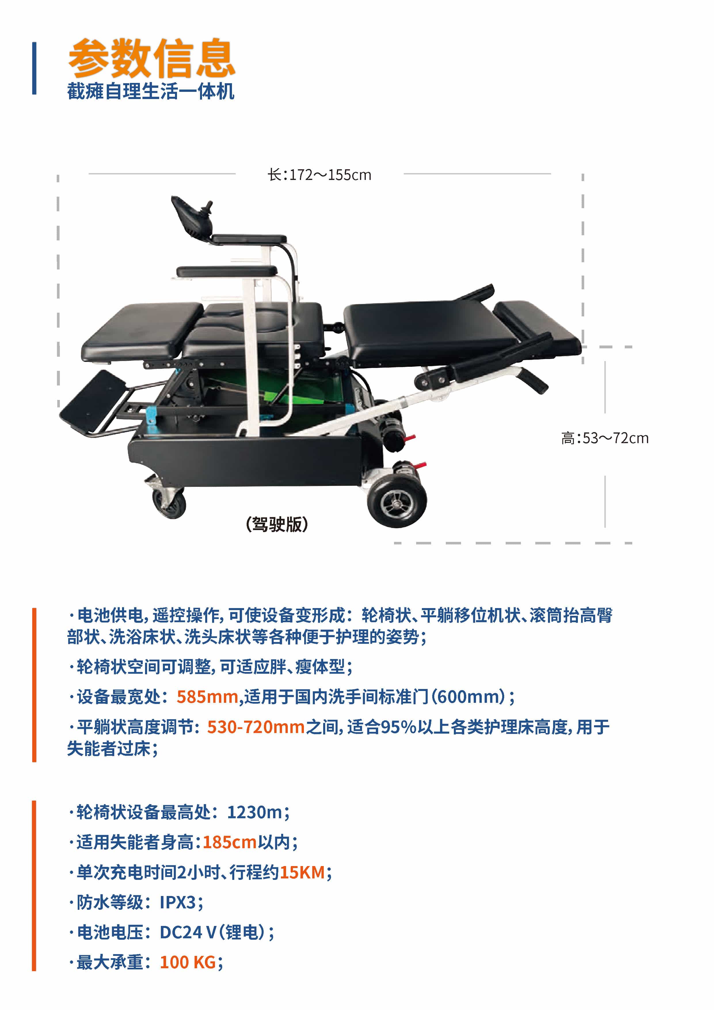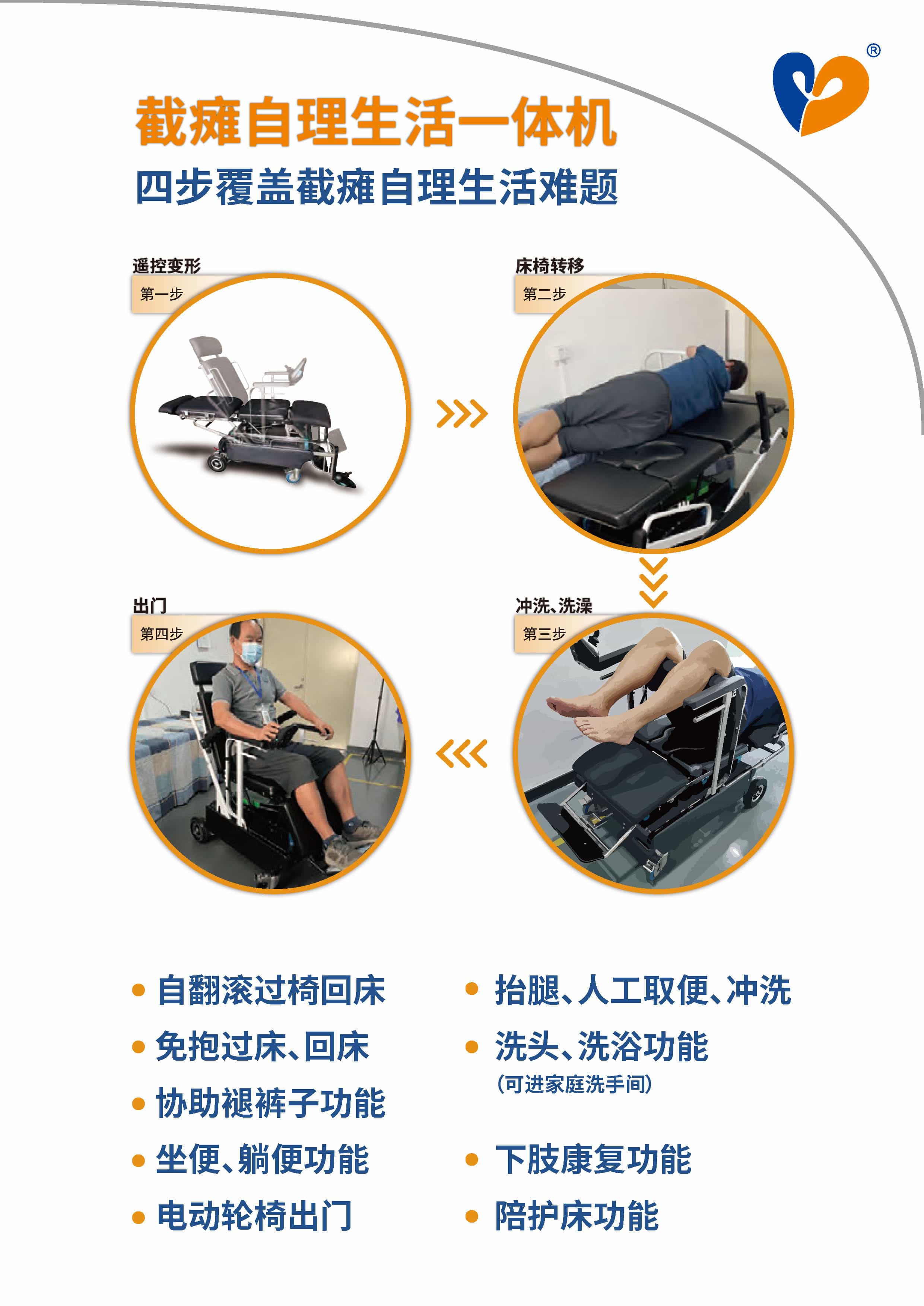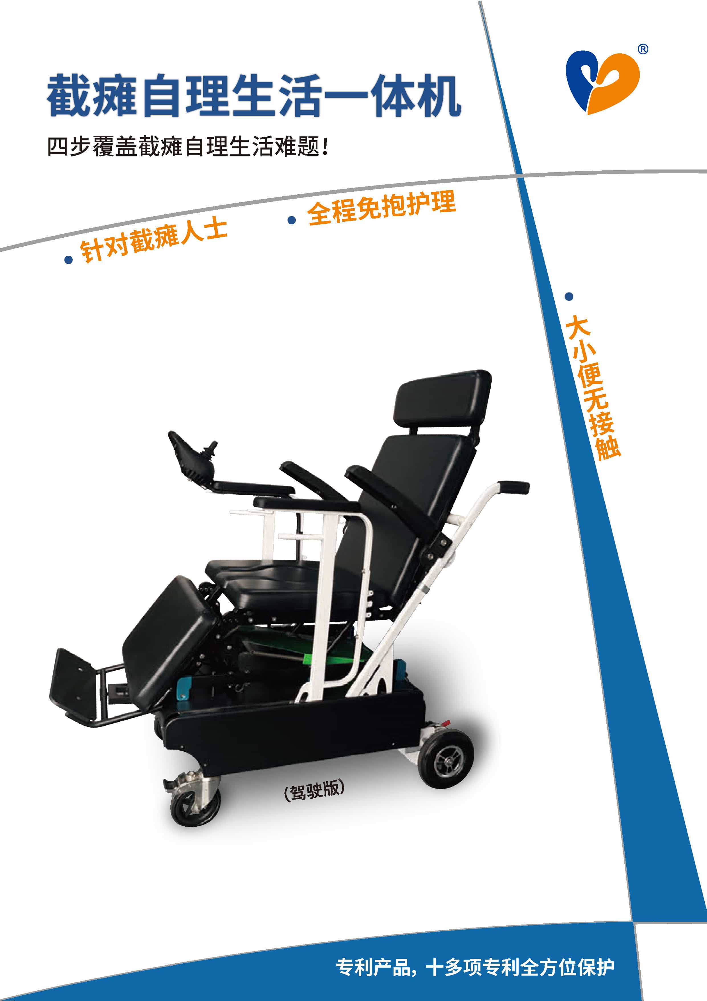 產(chǎn)品特點: 1)解決截癱患者床、椅相互轉移痛點,實現(xiàn)截癱患者轉移生活無障礙活動閉環(huán); 2)解決截癱患者自己處理二便、進浴室洗浴的基本生活問題; 3)提高截癱患者自理能力; 4)提高截癱患者就業(yè)率; 5)提高截癱患者個人尊嚴、個人隱私。 應用場景: 1.截癱患者在床上通過遙控對主機變形,使得主機與床等高并靠攏床邊、降下前扶手和靠背; 3、一部分截癱患者可以通過自身努力翻滾或上肢撐移的方式,實現(xiàn)由床轉