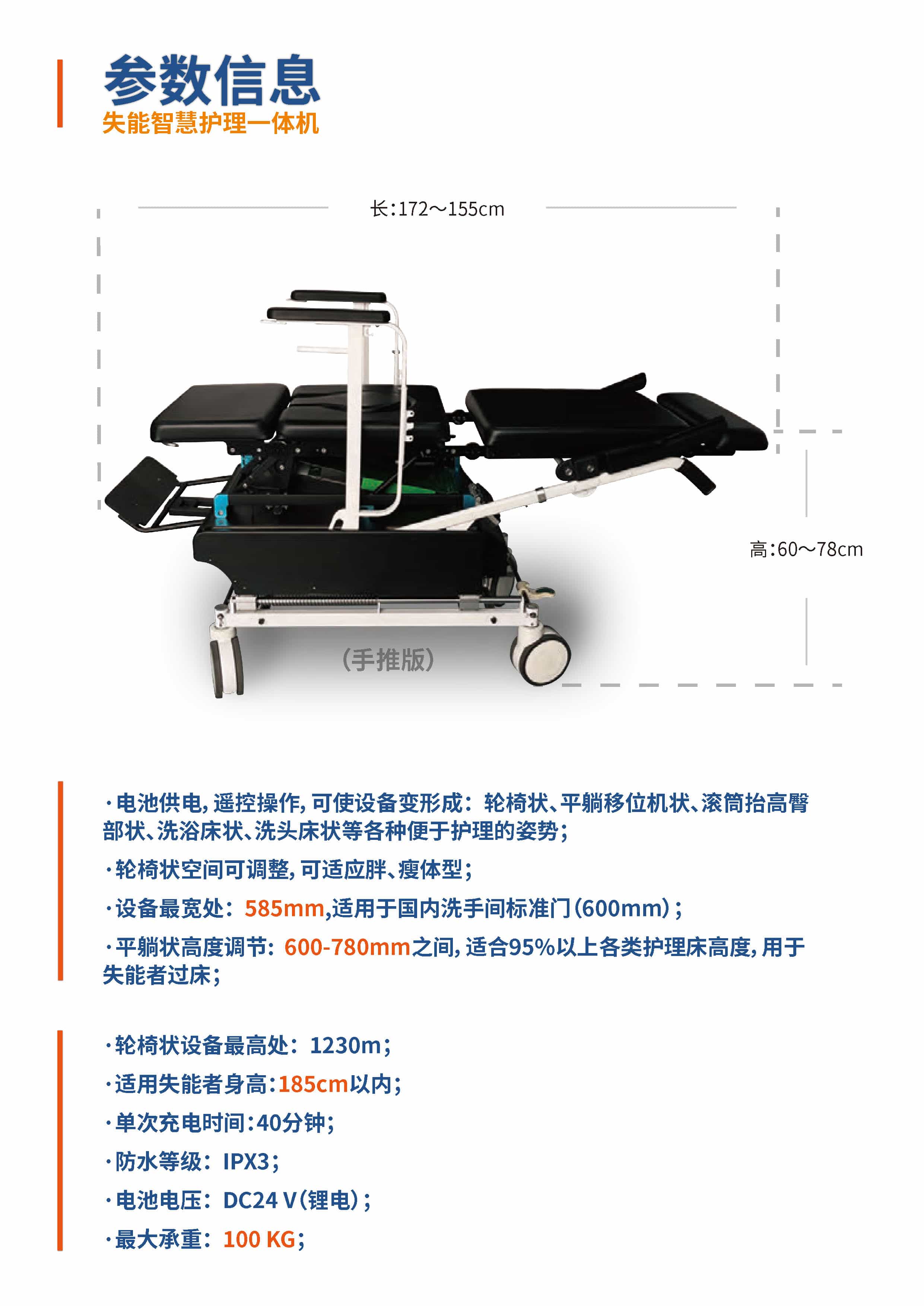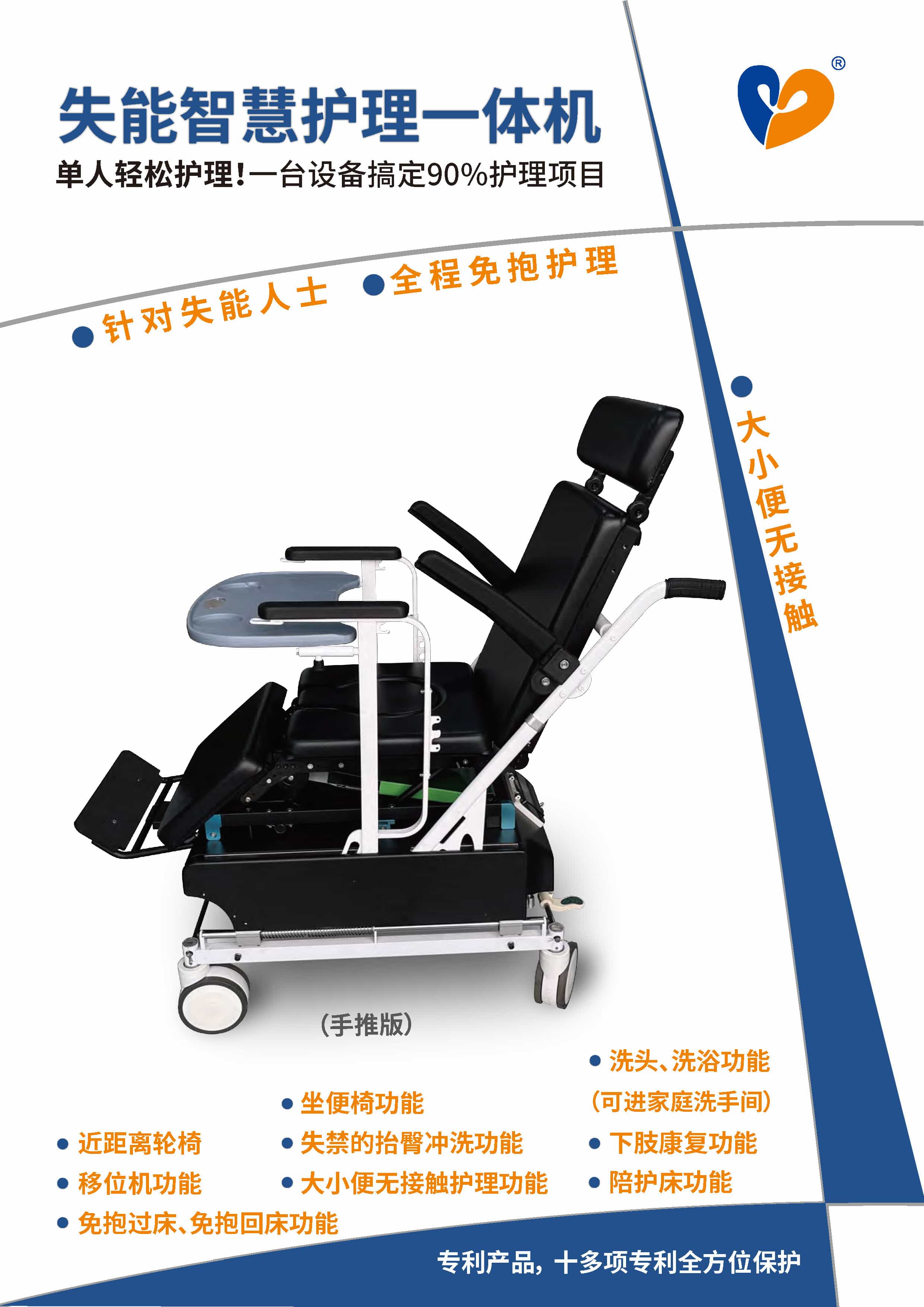 產(chǎn)品特點: 1)解決失能人士床、椅相互轉移痛點,實現(xiàn)失能人士轉移生活無障礙活動閉環(huán); 2)解決失能人士二便無接觸護理;、進浴室洗浴的基本生活問題; 3)解決失能人士進浴室洗浴、洗頭等衛(wèi)生問題; 4)解決失能人士長期臥床生活問題,使失能人士出門曬太陽、 鄰里互動方便問題; 5)保障失能人士個人尊嚴、個人隱私問題 6)解決失能人士護理環(huán)境惡劣問題; 7)解決失能人士腿褲子坐便難問題 應用場景: