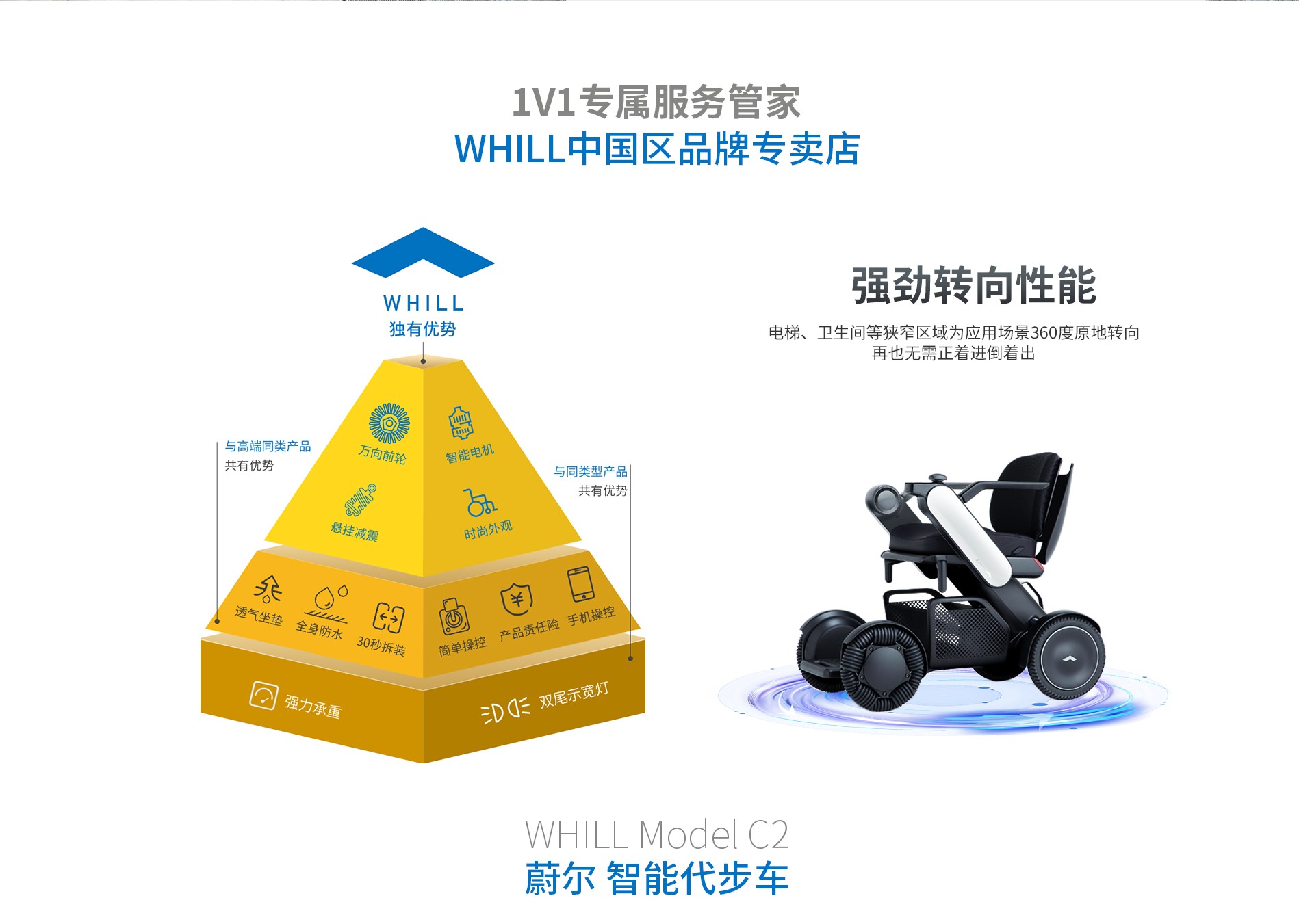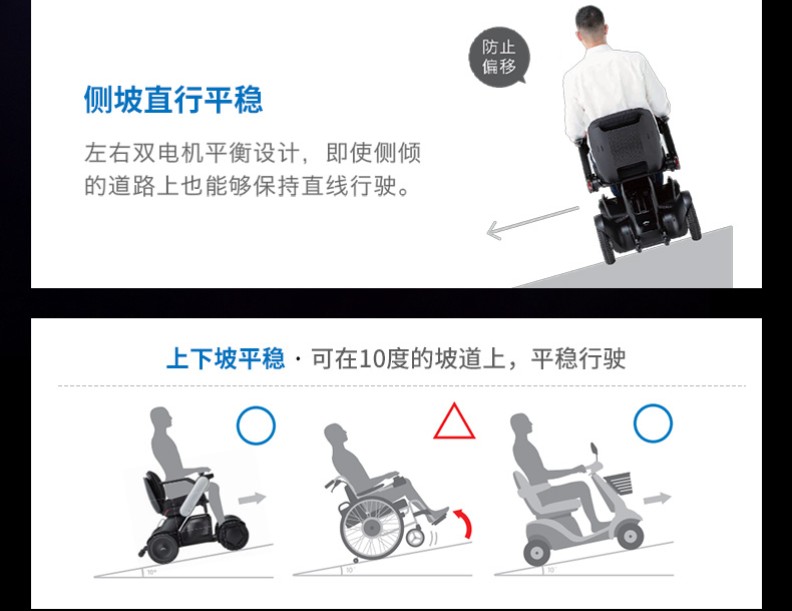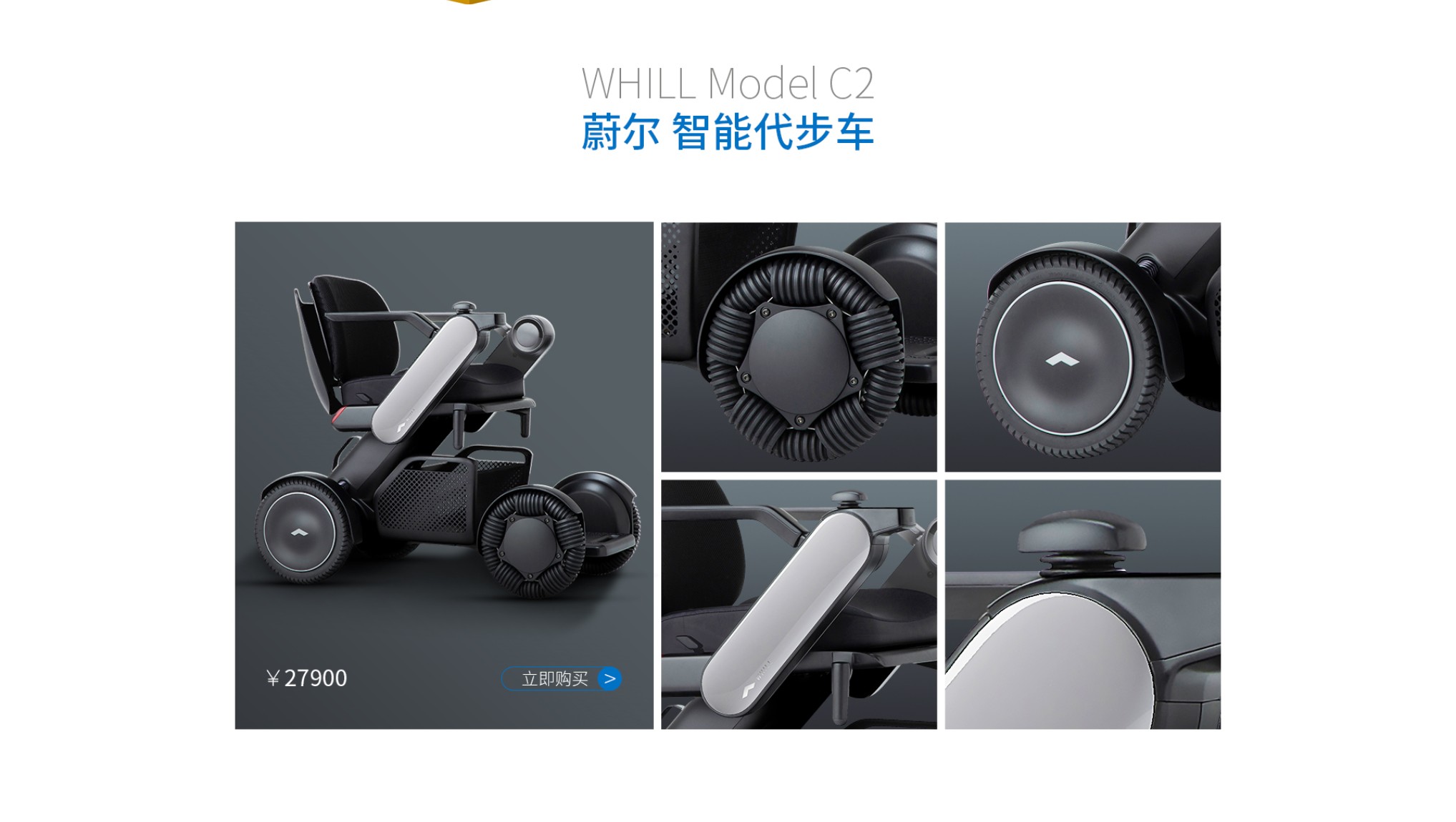 Whill(蔚爾)的使命,為所有人的出行帶來創(chuàng)新和快樂。2009年誕生第一款概念機(jī),2012年WHILL公司在日本建立,經(jīng)過12年,如今有了MODEL F和C2兩款智能代步車。MODEL C2在2019年全球同步發(fā)售,上市后獲得無數(shù)大獎。配有日本尼得科無刷雙電機(jī),動力強(qiáng)勁輸出穩(wěn)定。前輪與馬自達(dá)汽車公司開發(fā)的特殊專利Omni輪(萬向輪胎),實(shí)現(xiàn)原地76厘米半徑轉(zhuǎn)。彎。