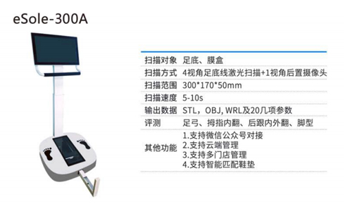 精易迅eSole-300A 足底三維掃描儀是一款專業(yè)針對(duì)人體足底三維掃描的測量設(shè)備,采用非接觸式激光掃描方式,10秒鐘內(nèi)完成人體足底的三維數(shù)據(jù)的采集,生成20幾項(xiàng)參數(shù),支持全負(fù)重,半負(fù)重或無負(fù)重足底掃描,可以有效的開展矯形鞋墊設(shè)計(jì)、個(gè)性化定制足墊、科學(xué)選鞋、足病診斷和足病矯正等多種工作;廣泛應(yīng)用于醫(yī)療、體育、鞋店零售等領(lǐng)域