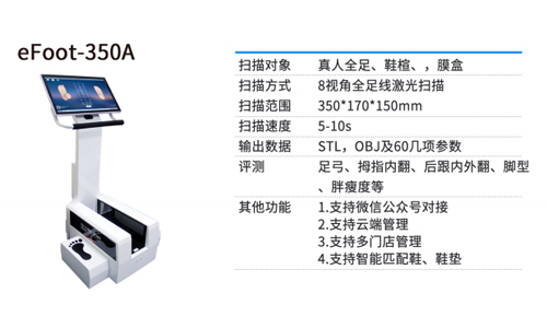 eFoot-350-A腳型3D掃描儀(單腳)可對(duì)人體腳型,鞋楦楦型進(jìn)行三維掃描,采集高精度腳型和楦型3D數(shù)據(jù),并生成60幾組個(gè)性化測(cè)量參數(shù),支持上傳與下載,廣泛用于制鞋產(chǎn)業(yè)與醫(yī)療康復(fù)領(lǐng)域.