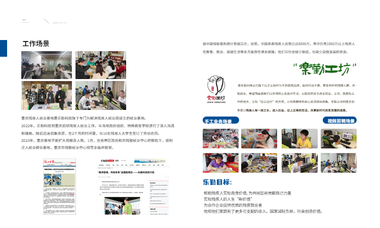 樂(lè)勤科技是一家在黨和國(guó)家的方針政策指引下運(yùn)用互聯(lián)網(wǎng)技術(shù)為殘障者提供優(yōu)質(zhì)的工作崗位和技能培訓(xùn)的平臺(tái)公司。培訓(xùn)的內(nèi)容有視頻剪輯、數(shù)據(jù)標(biāo)注、視頻及文字審核以及手工制作等,使殘疾人有一技之長(zhǎng),共享新時(shí)代改革發(fā)展的成果。