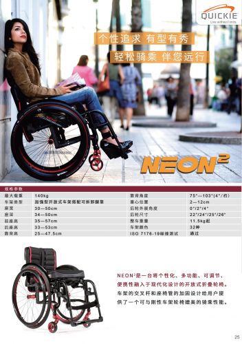 Neon2 是一臺(tái)將個(gè)性化、多功能可調(diào)節(jié)、便攜性融入于現(xiàn)代化設(shè)計(jì)的開放式折疊輪椅,車架的交叉桿和座椅管的加固設(shè)計(jì)給用戶提供了一個(gè)可與剛性車架輪椅媲美的騎乘性能。