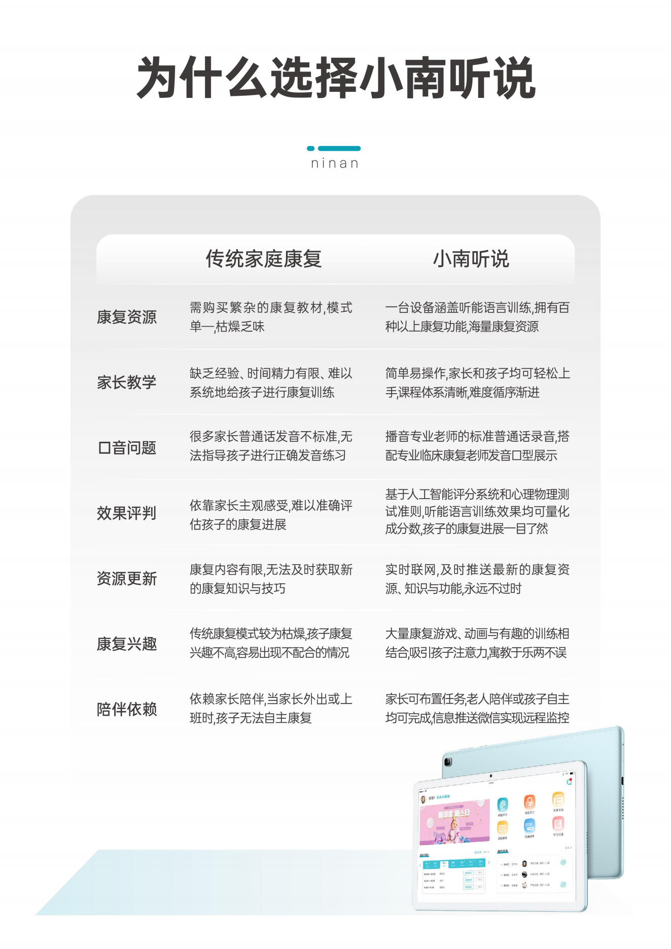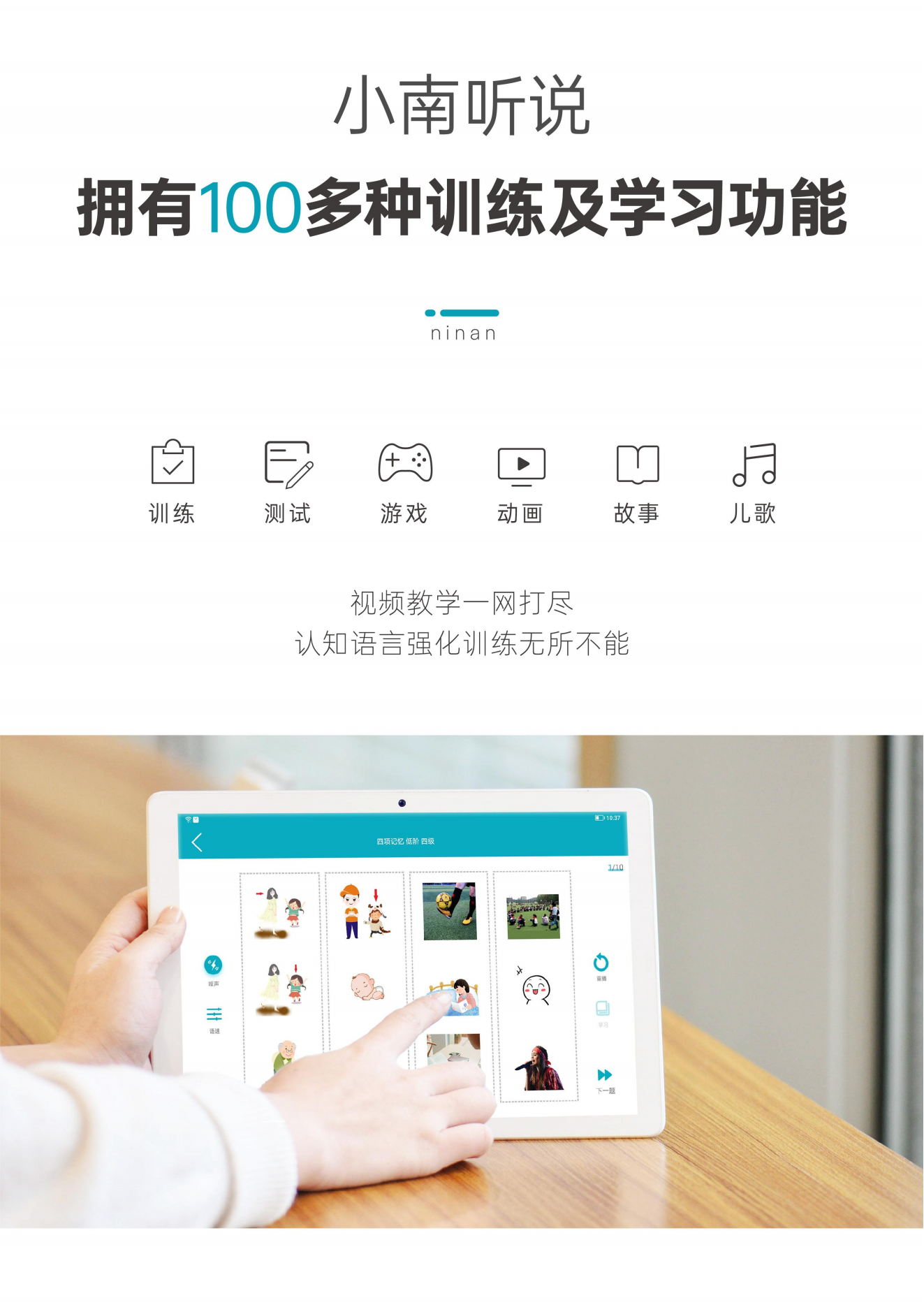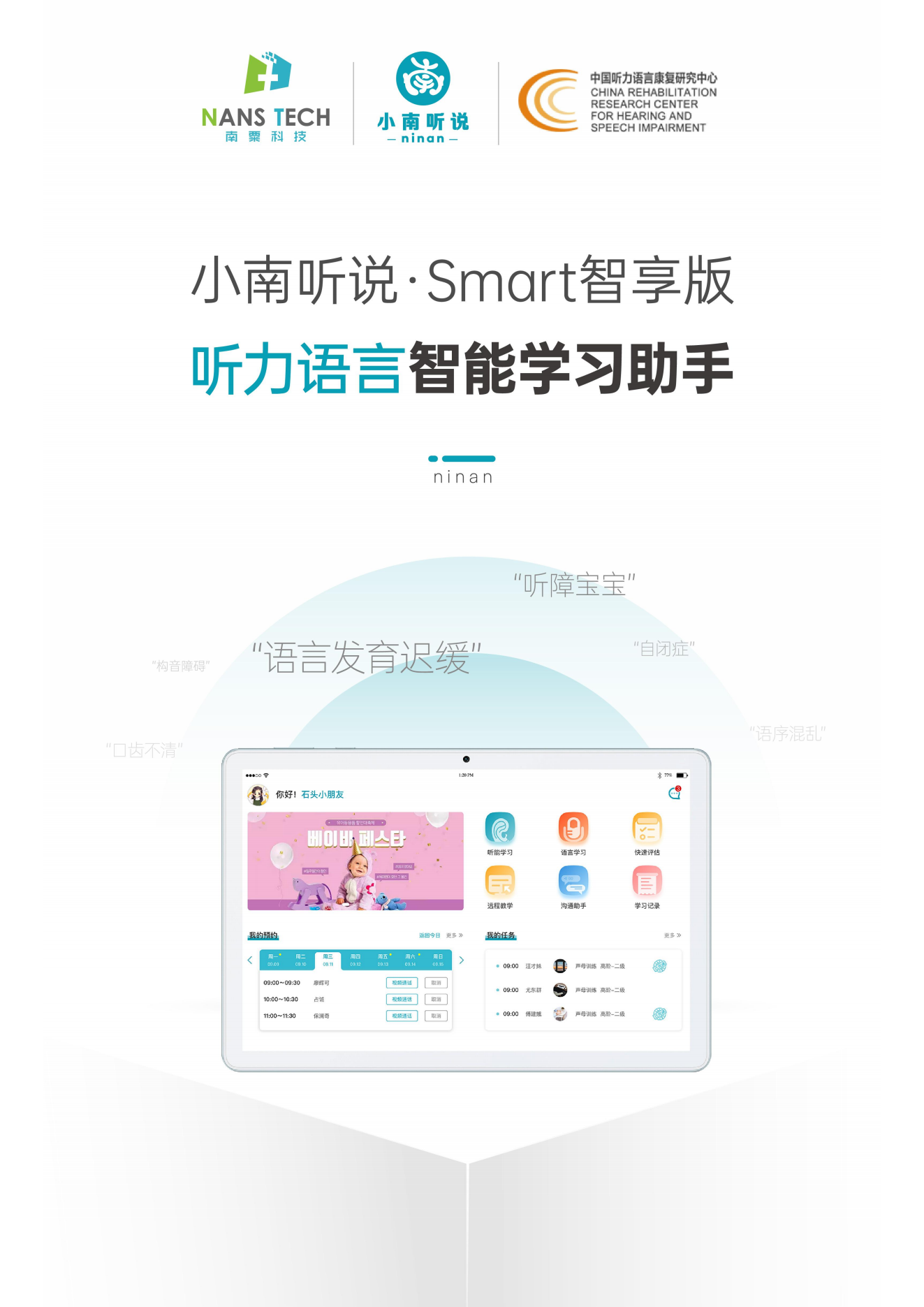 小南聽說聽力語言智能康復(fù)助手是一款基于人工智能和數(shù)字康復(fù)技術(shù)的語言康復(fù)產(chǎn)品,主要面向各類語言、認(rèn)知及聽力障礙的兒童,由一套智能訓(xùn)練系統(tǒng)和一套智能硬件設(shè)備組成,目前主要有專業(yè)版和智享版兩種硬件形態(tài),可實(shí)現(xiàn)智能化的家庭/機(jī)構(gòu)全方位康復(fù)訓(xùn)練。