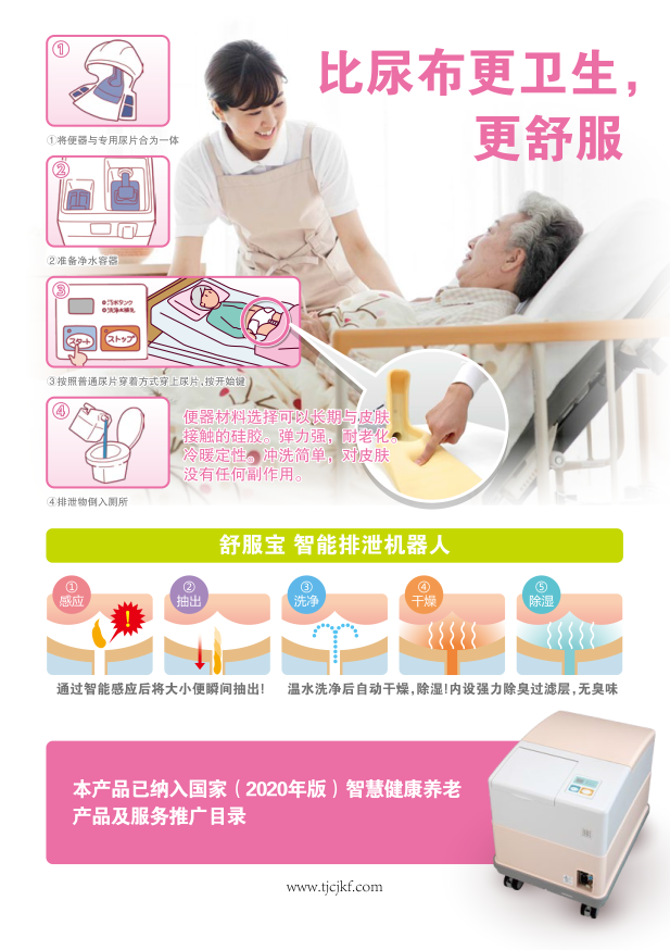 當(dāng)患者意識(shí)上有大小便排泄時(shí),鑲嵌在臀部墊下面的感應(yīng)功能芯片,傳導(dǎo)到管理中心,電腦即時(shí)發(fā)出指令:瞬間開(kāi)啟吸收功能鍵,將排泄物排泄到污物桶。 自動(dòng)開(kāi)啟溫水沖洗功能鍵,清洗大小便排泄處。 自動(dòng)開(kāi)啟干燥除濕功能鍵,將私處用微微的暖風(fēng)吹干,患者長(zhǎng)時(shí)間的使用不會(huì)出現(xiàn)紅疹及褥瘡等現(xiàn)象。