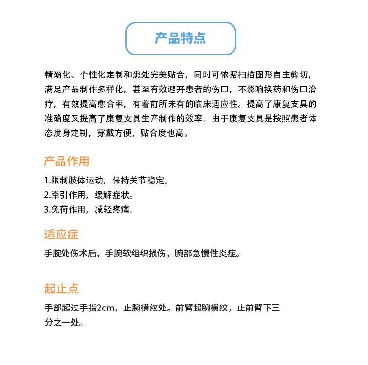 產(chǎn)品特點(diǎn) 精確化、個(gè)性化定制和患處完美貼合,同時(shí)可依據(jù)掃描圖形自主剪切,滿(mǎn)足產(chǎn)品制作多樣化,甚至有效避開(kāi)患者的傷口,不影響換藥和傷口治療,有效提高愈合率,有著前所未有的臨床適應(yīng)性。提高了康復(fù)支具的準(zhǔn)確度又提高了康復(fù)支具生產(chǎn)制作的效率。由于康復(fù)支具是按照患者體態(tài)度身定制,穿戴方便,貼合度也高。 產(chǎn)品作用 1.限制肢體運(yùn)動(dòng),保持關(guān)節(jié)穩(wěn)定。 2.牽引作用,緩解癥狀。 3.免荷作用,減輕疼痛。