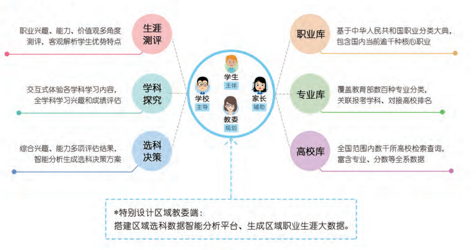核心功能: 通過(guò)霍蘭德興趣測(cè)評(píng)量表、多元智能測(cè)評(píng)量表、MBTI職業(yè)性格測(cè)評(píng)量表、WVI職業(yè)價(jià)值觀測(cè)試量表進(jìn)行興趣、能力、性格和價(jià)值觀的綜合分析,科學(xué)測(cè)評(píng)系統(tǒng)和完善的報(bào)告,智能推薦適合學(xué)科及專業(yè)職業(yè) 從選科決策、專業(yè)定位、職業(yè)方向到生涯規(guī)劃,形成完整的學(xué)業(yè)與生涯規(guī)劃路徑。從離學(xué)生最近的學(xué)科選擇開(kāi)始生涯之路的規(guī)劃,與學(xué)生的生活更接軌。大數(shù)據(jù)報(bào)告,幫助老師快速掌握全校學(xué)生的選擇意象。豐富的資源庫(kù)內(nèi)容