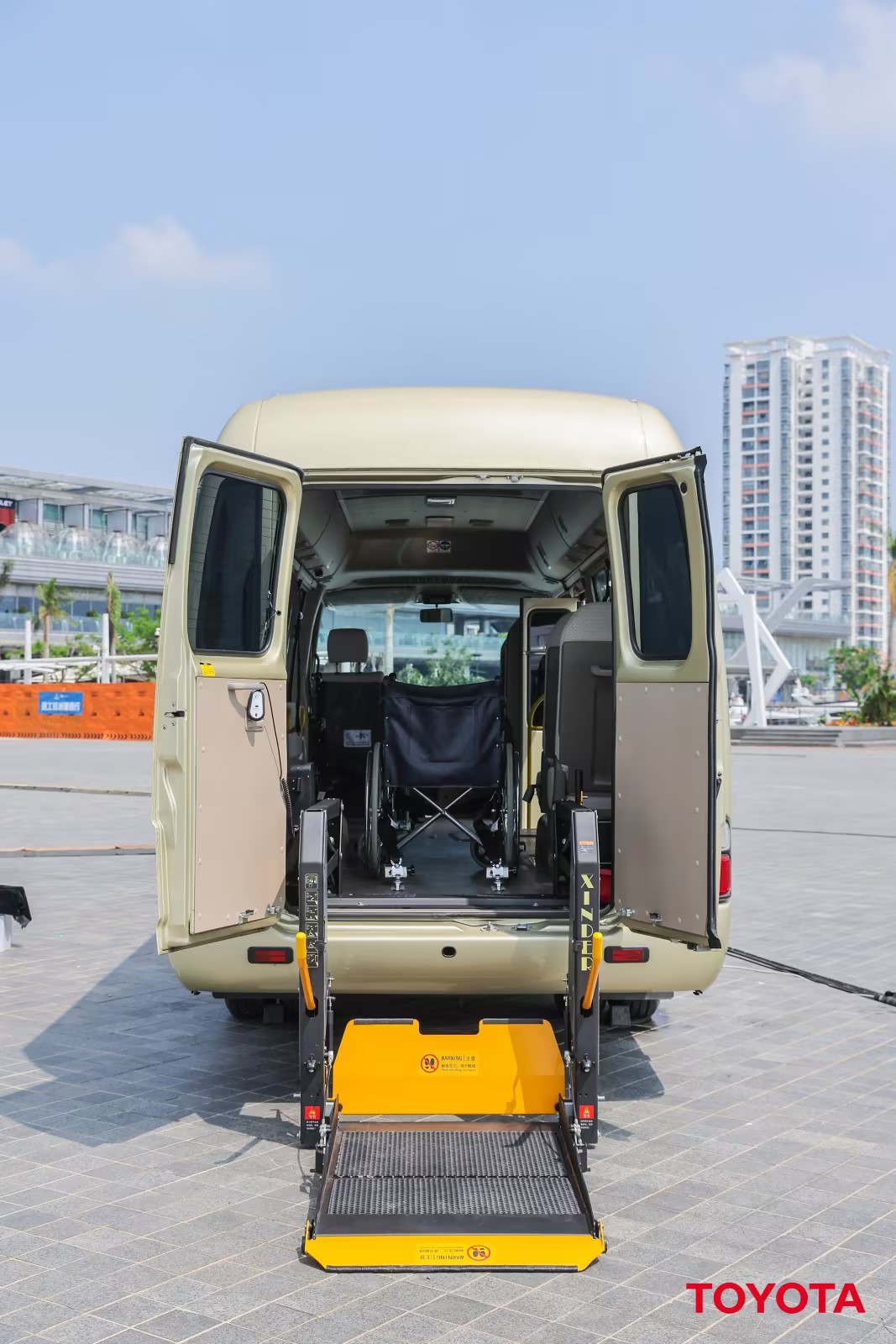輕型客車,汽油(92#),4.0L V6,5擋MT,9座(含駕駛位)正常座位5個,輪椅位4個,車后雙開門,搭載國產(chǎn)“信德泰克” 升降平臺,輪椅可直接進入車內(nèi),車內(nèi)配有輪椅固定裝置輪椅從后方乘車時,升降平臺上升需30s;固定輪椅:3min/輪*4 個輪椅=12min。通過升降平臺輔助乘車,適用于老年人、輪椅使用人士、殘疾人、機構(gòu)用。