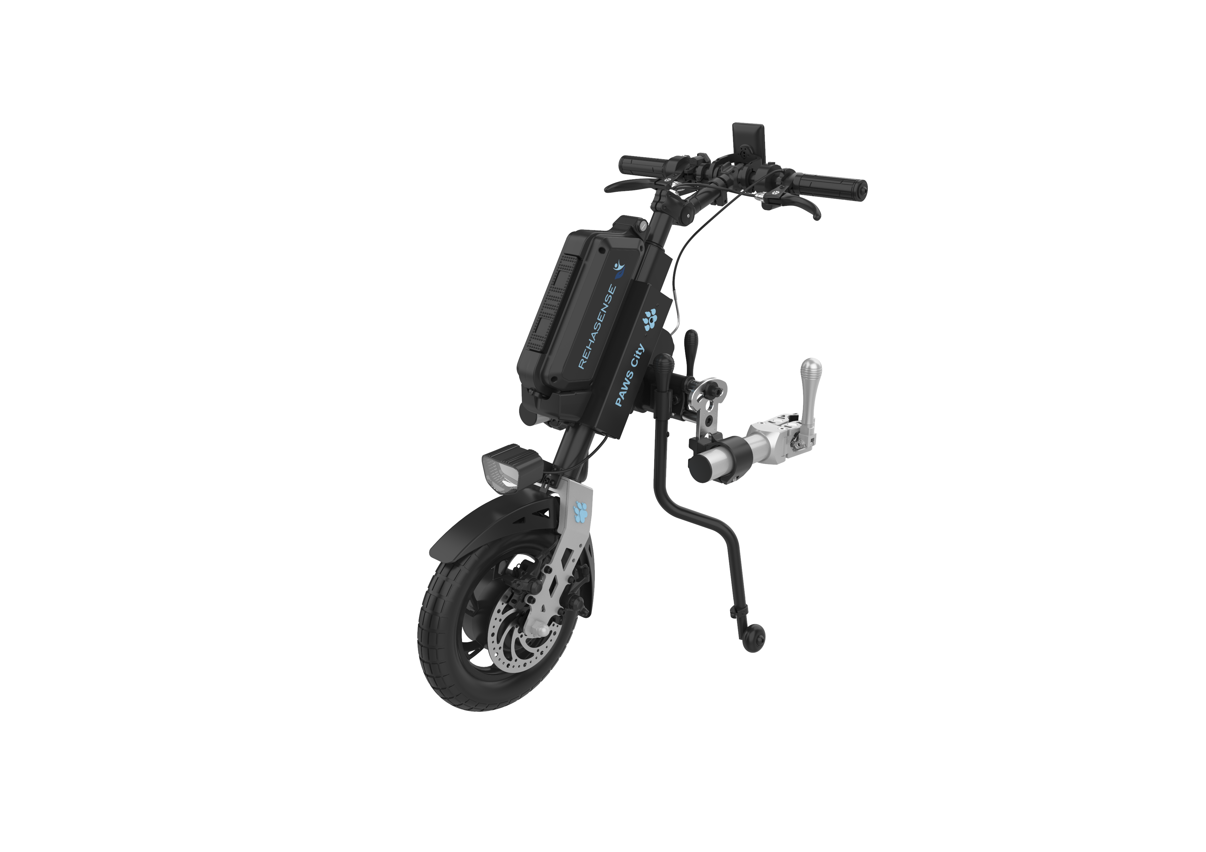PAWS是一款全新的輪椅牽引裝置。 PAWS將人機工程學與實用性功能相結合,將手動輪椅轉(zhuǎn)變?yōu)榱钊伺d奮的電動交通工具,讓用戶以自由的生活方式享受生活,借助它獨立地上班、購物或進行其他活動。 PAWS 有多種款式可選側(cè),短途用12寸和14寸前輪,有較小的轉(zhuǎn)彎半徑,適合室內(nèi)或者平坦的路面行駛。中途用16寸前輪,可以適應更多挑戰(zhàn)的路面。遠途用20寸前輪,有更大的輪胎面,可以挑戰(zhàn)更復雜的路面。