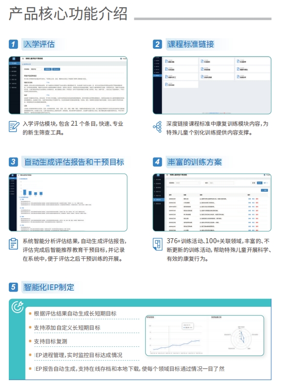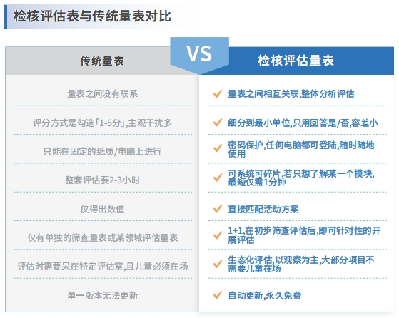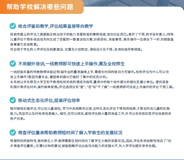 特殊兒童評估干預(yù)系統(tǒng)是一套以檢核評估理念為依據(jù)的非標(biāo)準(zhǔn)化評估工具,從特殊兒童能力角度出發(fā),適用于各類特殊兒童,包含感知、認(rèn)知、運動、社會適應(yīng)、生活自理、社交技巧、語言與溝通七大領(lǐng)域評估,同時系統(tǒng)內(nèi)嵌入的活動方案為新晉特教教師提供了個訓(xùn)實操參考,是一款簡單實用并兼具專業(yè)性的評估工具。