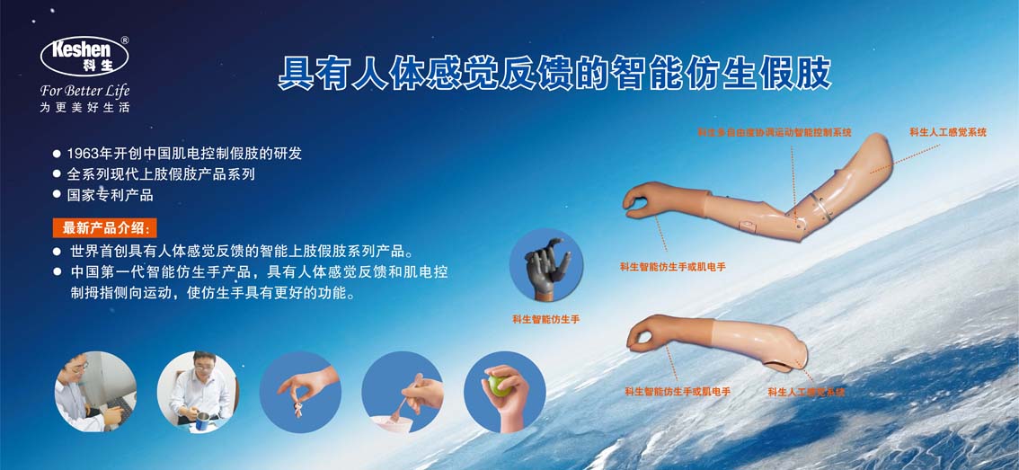 “世界首創(chuàng)有人體感覺反饋智能仿生手假肢產品。手部為智能仿生手或二維拇指肌電手。不依賴視覺,可感覺握物和握力大小。各關節(jié)包括手、腕、肘智能協同動作,使高位截肢者也能自如取食、吃飯、使用方便。可藍牙多功能設置。國家專利產品。”