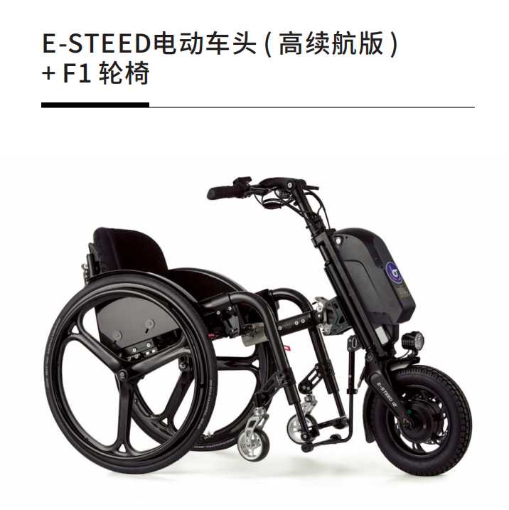 E-steed電動(dòng)handbike,可以和手動(dòng)輪椅配套構(gòu)成一種新式的電動(dòng)輪椅,既有手動(dòng)輪椅的靈活性,又具備了接近電動(dòng)自行車的行駛速度和通過能力,很好的提升使用體驗(yàn)和出行效率。 E-steed最快速度25KM/H, 最大續(xù)航里程60公里,具備倒擋,集成前照明燈和警示喇叭。 BRAXEN BAGGIO首創(chuàng)的中置式鏈接提供穩(wěn)定可靠的使用感受,可以無損拆裝,對輪椅車架沒有負(fù)面影響。