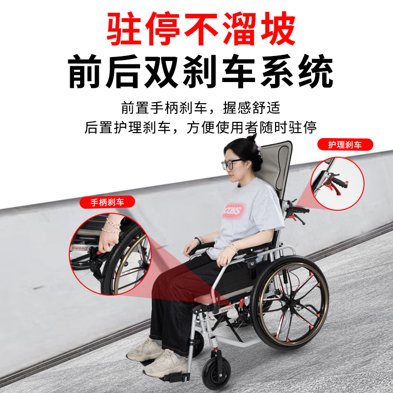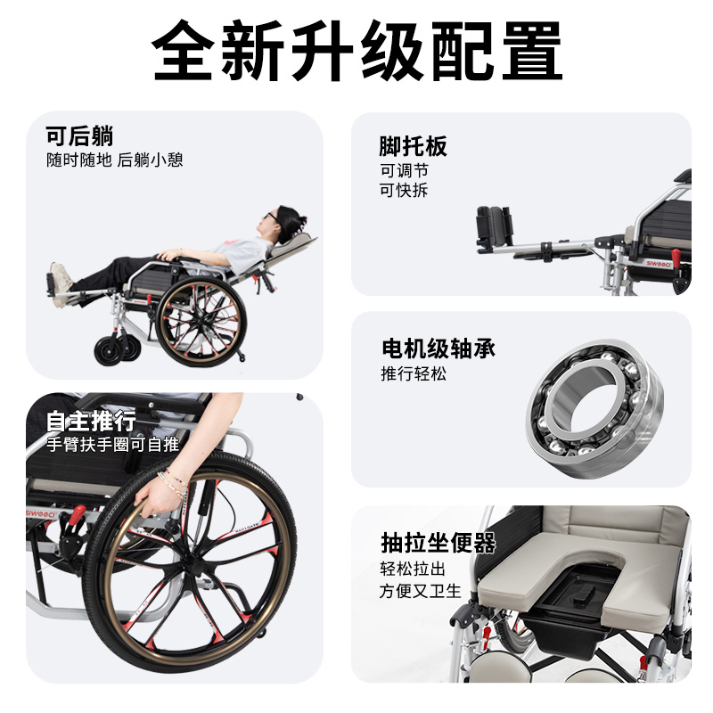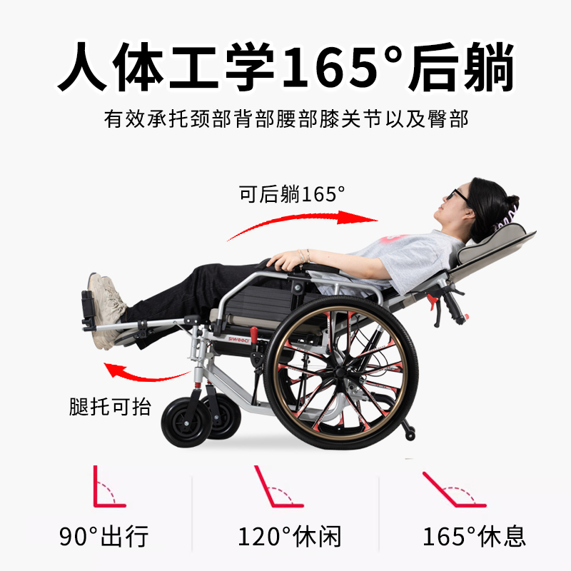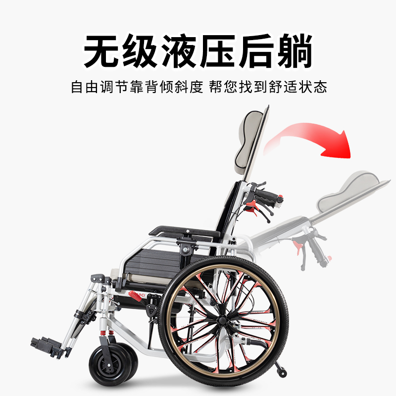 1、航空鋁合金材質,輕便、結實耐用 2、鎂合金輪轂,滑行更輕松 3、24寸大后輪,高靠背,輕松后躺,乘坐更舒適 4、前后雙剎車,便攜方便 5、高分子復合材料靠背墊,易清潔 6、快拆式可抬起腳踏,兩側扶手均可抬,方便上下車