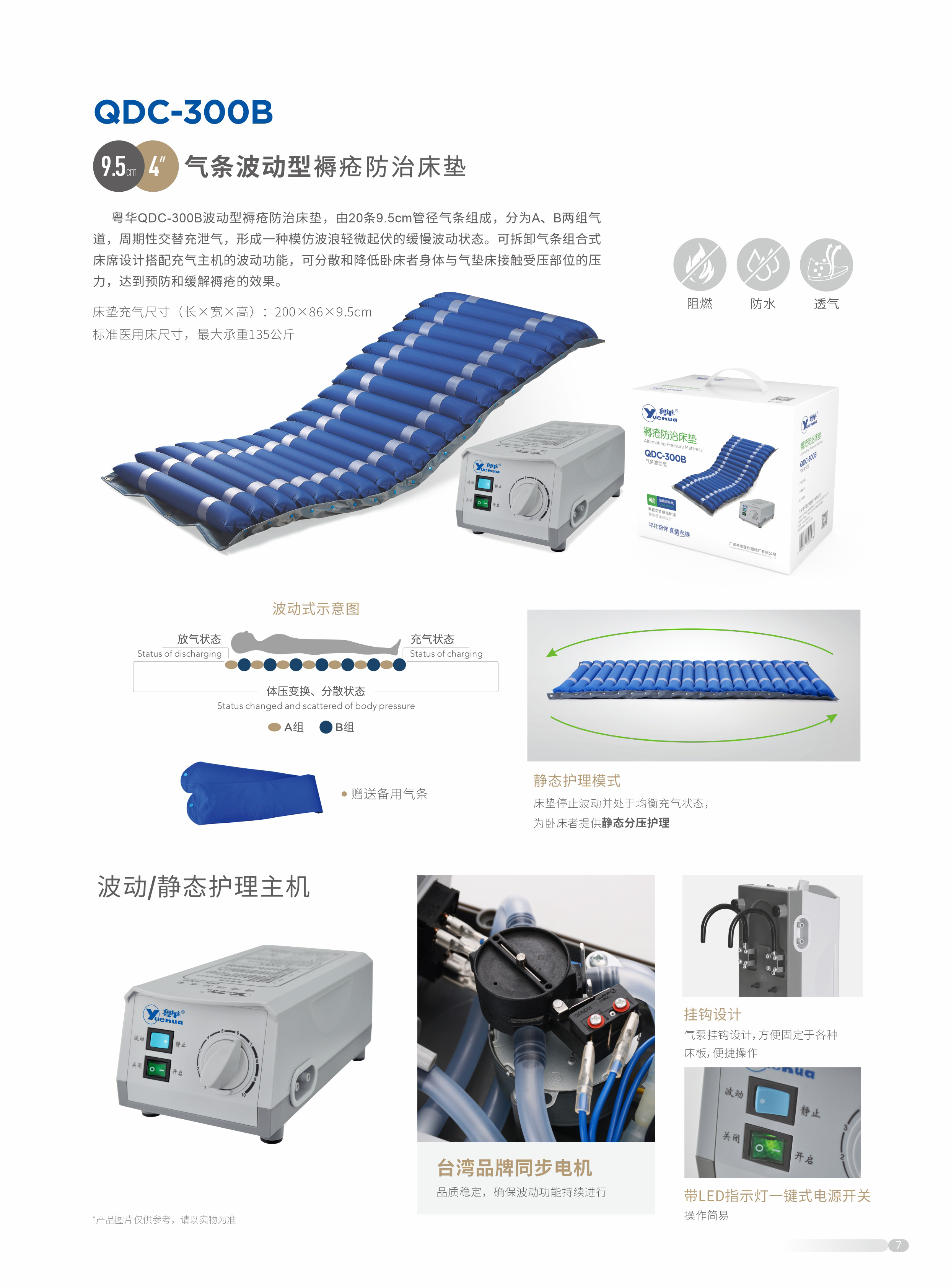 粵華QDC-300B波動型褥瘡防治床墊,由20條9.5cm管徑氣條組成,分為A、B兩組氣道,周期性交替充泄氣,形成一種模仿波浪輕微起伏的緩慢波動狀態(tài)??刹鹦稓鈼l組合式床席設計搭配充氣主機的波動功能,可分散和降低臥床者身體與氣墊床接觸受壓部位的壓力,達到預防和緩解褥瘡的效果。