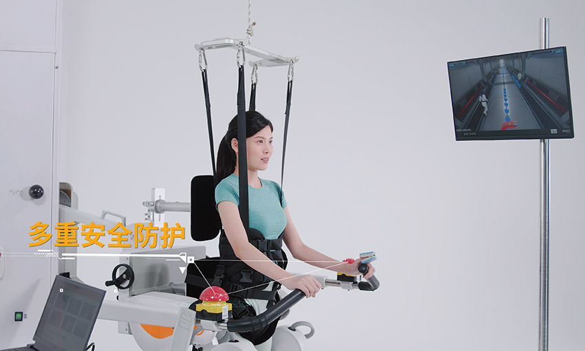 這是一款針對(duì)步行功能障礙進(jìn)行高效康復(fù)訓(xùn)練的下肢康復(fù)機(jī)器人。產(chǎn)品由計(jì)算機(jī)控制系統(tǒng)、步態(tài)矯正裝置系統(tǒng)、動(dòng)靜態(tài)減重系統(tǒng)、醫(yī)用跑臺(tái)系統(tǒng)以及情景互動(dòng)訓(xùn)練系統(tǒng)五大模塊組成。它可以使患者在直立體位下通過(guò)不斷重復(fù)且軌跡固定的步態(tài)訓(xùn)練,強(qiáng)化正常步態(tài)記憶,促進(jìn)患者本體感覺(jué)的輸入與正確運(yùn)動(dòng)模式的形成,從而加強(qiáng)大腦結(jié)構(gòu)和功能重塑,建立正確的行走模式并有效的鍛煉其相關(guān)肌肉與關(guān)節(jié),加速下肢功能的恢復(fù)。