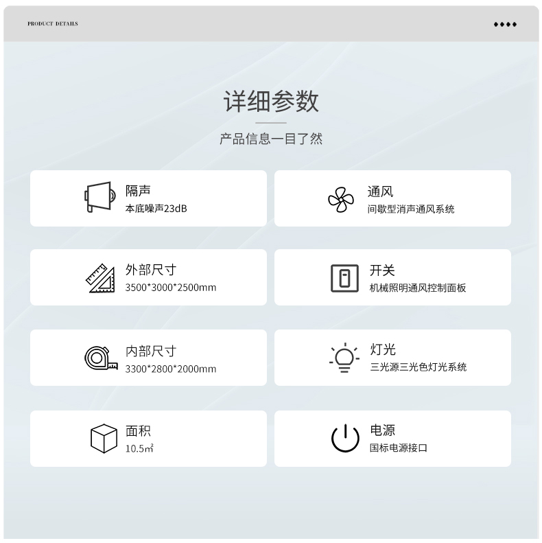 型號:L350 隔聲:室外環(huán)境噪聲≤55dB (A),室內(nèi)本底噪聲≤23dB (A) 環(huán)保:甲醛釋放量≤0.4mg/L,滿足《室內(nèi)裝飾裝修材料及人造板棉制品中甲醛釋放量》 參考標(biāo)準(zhǔn): JJF 1191-2019《測聽室聲學(xué)特性校準(zhǔn)規(guī)范》 GB 3096-2022《聲環(huán)境質(zhì)量標(biāo)準(zhǔn)》 GB 50325-2020《民用建筑工程室內(nèi)環(huán)境污染控制標(biāo)準(zhǔn)》 適用范圍:純音測聽、言語測聽、兒童聽覺言語檢測評估