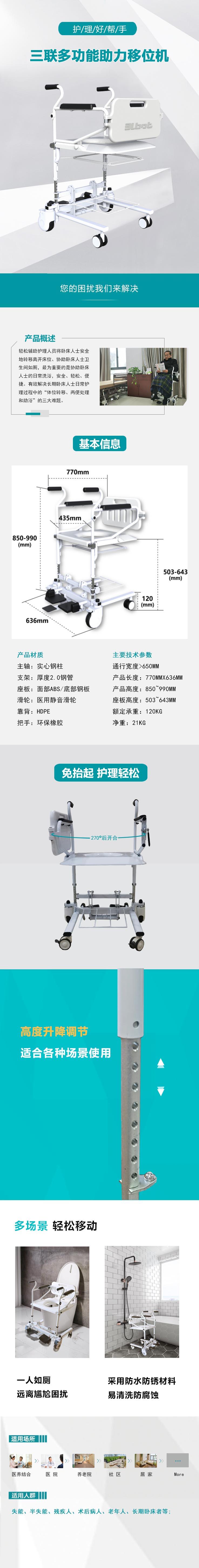 三聯(lián)多功能助力移位機(jī),輕松的解決了照護(hù)老人、殘疾人過程中移位、如廁、助浴的三大難題。產(chǎn)品獨(dú)創(chuàng)270°后開合設(shè)計(jì),免抬起護(hù)理更輕松;高度可升降,適合多種場景;整體采用防水防銹材料,易清洗。