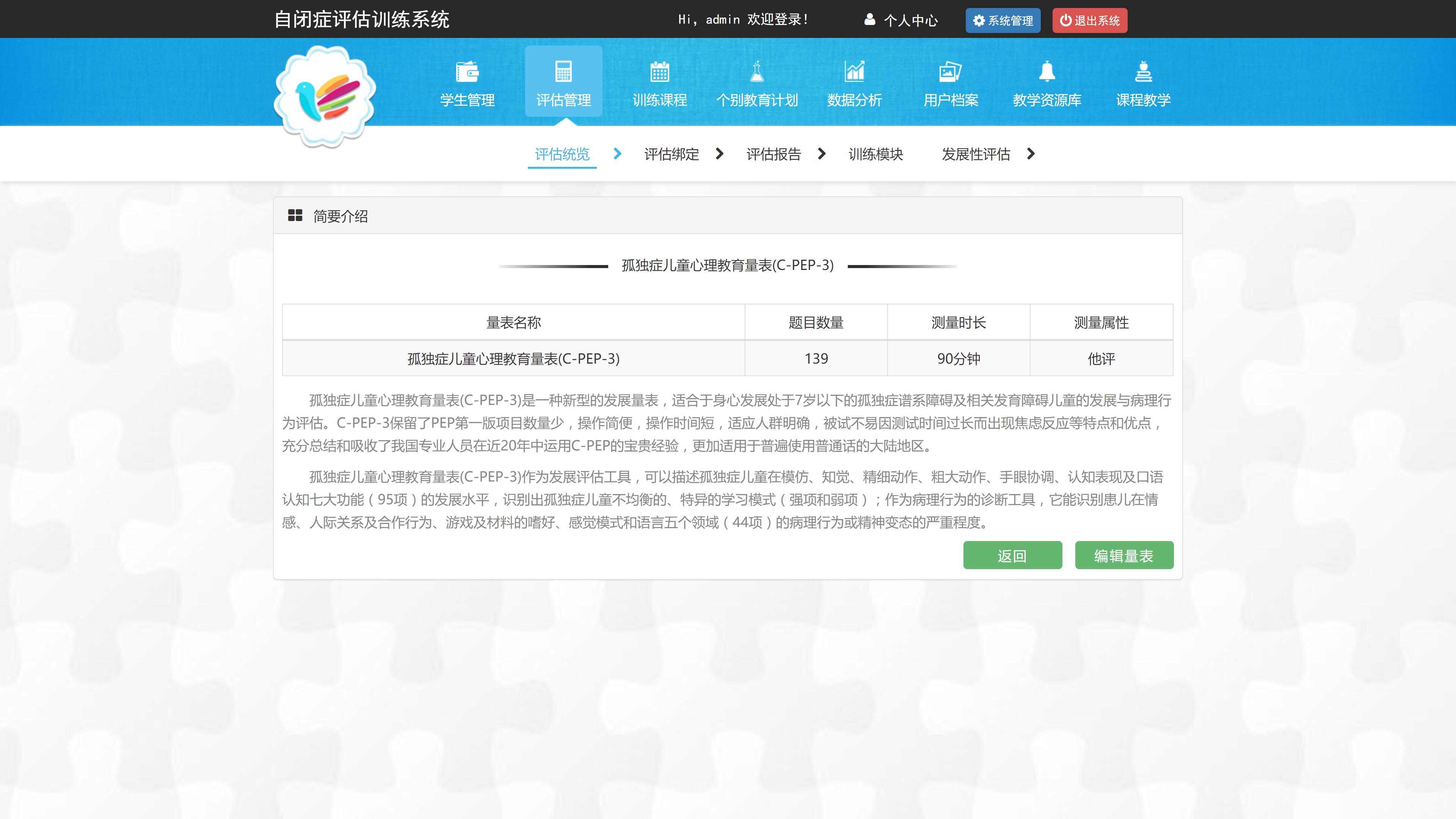 自閉癥評估與訓練儀由自閉癥評估子系統、自閉癥訓練子系統、個別教育計劃(IEP)子系統、數據分析子系統、課程教學子系統、學習資源子系統等數個專門針對自閉癥兒童評估教學訓練設計的子系統組成。 系統共包括管理端、家長端、學生端三個用戶端,分別提供給不同身份用戶使用。