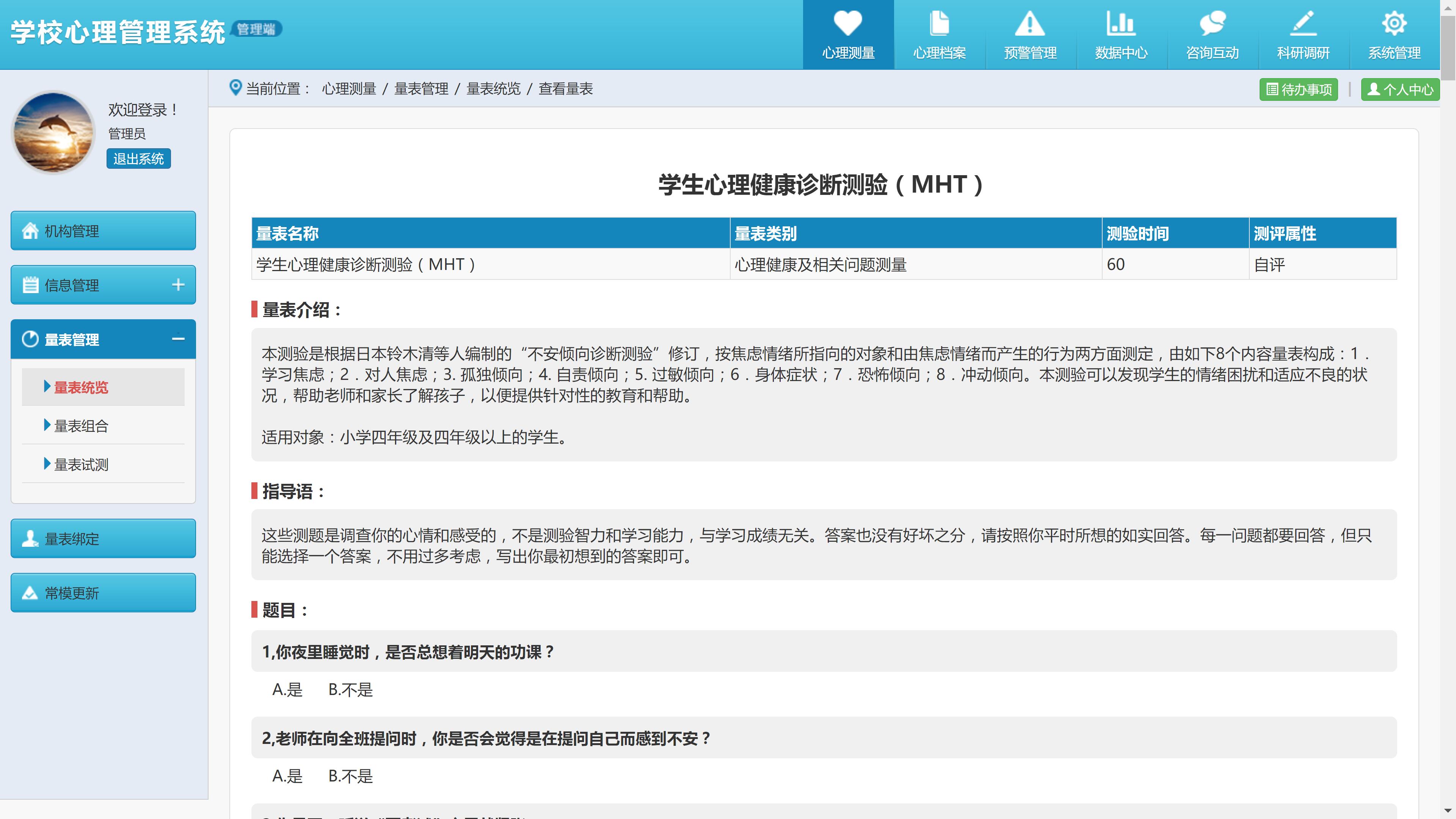 心理健康信息化綜合管理平臺(tái)(心理健康云平臺(tái))是集學(xué)校綜合管理系統(tǒng)、心理咨詢師管理系統(tǒng)、學(xué)生測(cè)評(píng)系統(tǒng)、教師測(cè)評(píng)系統(tǒng)、家長(zhǎng)測(cè)評(píng)系統(tǒng)等五大子系統(tǒng)于一體,將校長(zhǎng)、心理教師、教師、學(xué)生、家長(zhǎng)多角色進(jìn)行分類管理的學(xué)校心理教育工作綜合管理平臺(tái),五大子系統(tǒng)通過綜合的心理健康網(wǎng)站平臺(tái)進(jìn)行集中統(tǒng)合管理。