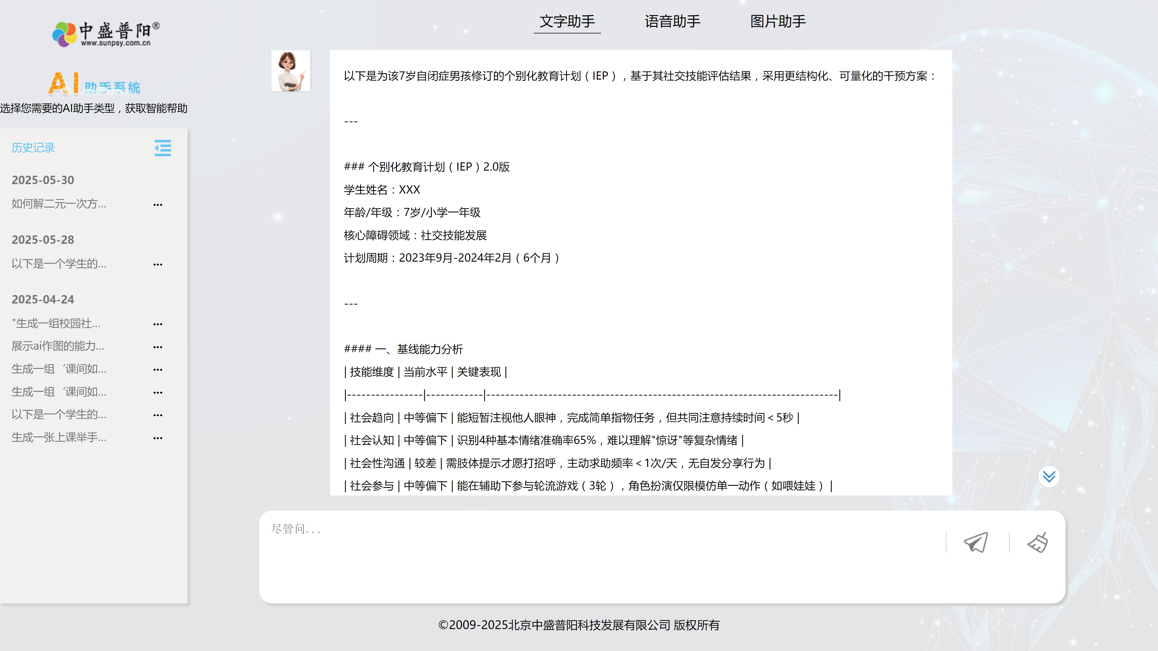 融合教育云平臺(tái)以現(xiàn)代特殊教育體系為背景,全面落實(shí)“一生一案”政策,結(jié)合IEP輔導(dǎo),構(gòu)建完整的學(xué)生檔案,平臺(tái)提供了學(xué)生評(píng)估、IEP個(gè)別教育計(jì)劃制定、豐富的訓(xùn)練課程及資源教師成長(zhǎng)資源。包括學(xué)校端、教師端、學(xué)生端&家長(zhǎng)端四個(gè)端口,可以滿(mǎn)足學(xué)校、學(xué)生、家長(zhǎng)間的融合教育需要。實(shí)現(xiàn)特殊兒童的全面化、人性化管理。