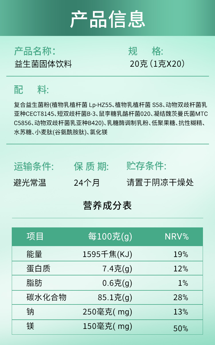 本品含七種復(fù)合專(zhuān)利的進(jìn)口益生菌,每盒活性菌含量達(dá)4000億CFU,高活性含量益生菌調(diào)節(jié)菌群平衡,促進(jìn)有益菌的生長(zhǎng),抑制有害菌。同時(shí),益生菌可助于對(duì)營(yíng)養(yǎng)物質(zhì)的吸收效率。