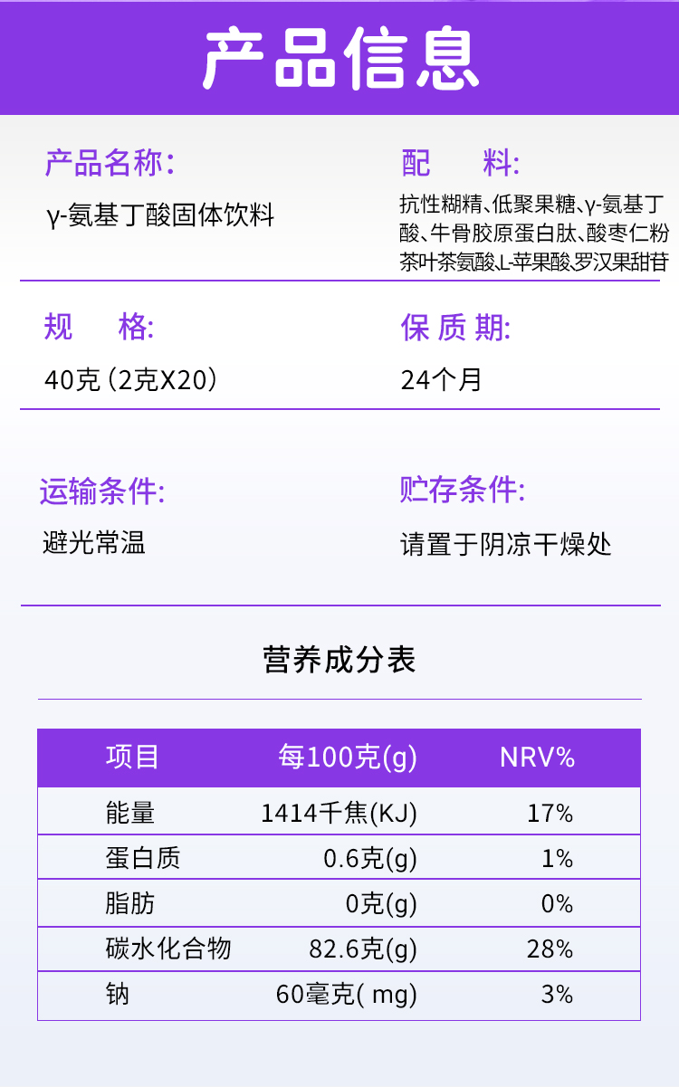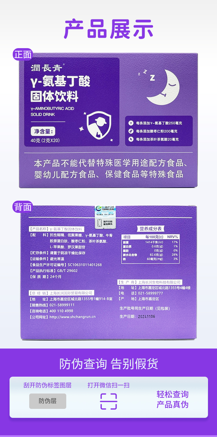 本品是以γ-氨基丁酸為關(guān)鍵成分,同時搭配酸棗仁粉、茶葉茶氨酸等核心成分調(diào)配而成。γ-氨基丁酸是一種天然存在于人體的非蛋白質(zhì)氨基酸,它在神經(jīng)系統(tǒng)中有著重要作用,是主要的抑制性神經(jīng)遞質(zhì),配方的設(shè)計主要針對需要緩解焦慮情緒和精神壓力。