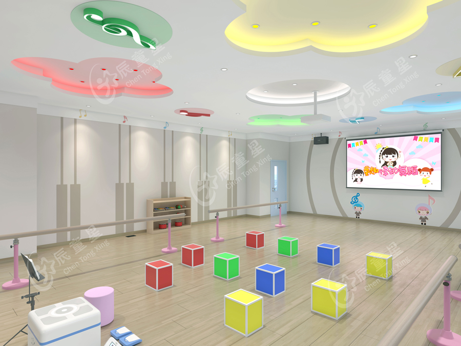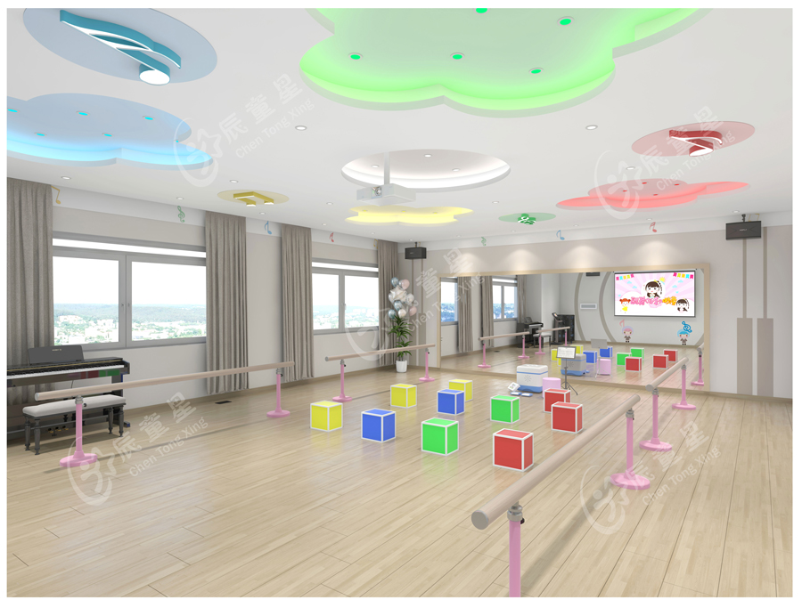 音樂律動室是聽障、盲障、智力障礙學(xué)生進(jìn)行舞蹈、體操、游戲、音樂教學(xué)及其它藝術(shù)活動的場所,其環(huán)境設(shè)計(jì)有利于特殊學(xué)生通過視覺和殘余聽力模仿動作、感受舞蹈的音樂節(jié)奏。律動教室通過訓(xùn)練學(xué)生的視、聽、觸等綜合能力,使其注意力、記憶力、感知力、結(jié)構(gòu)化能力得到加強(qiáng)。