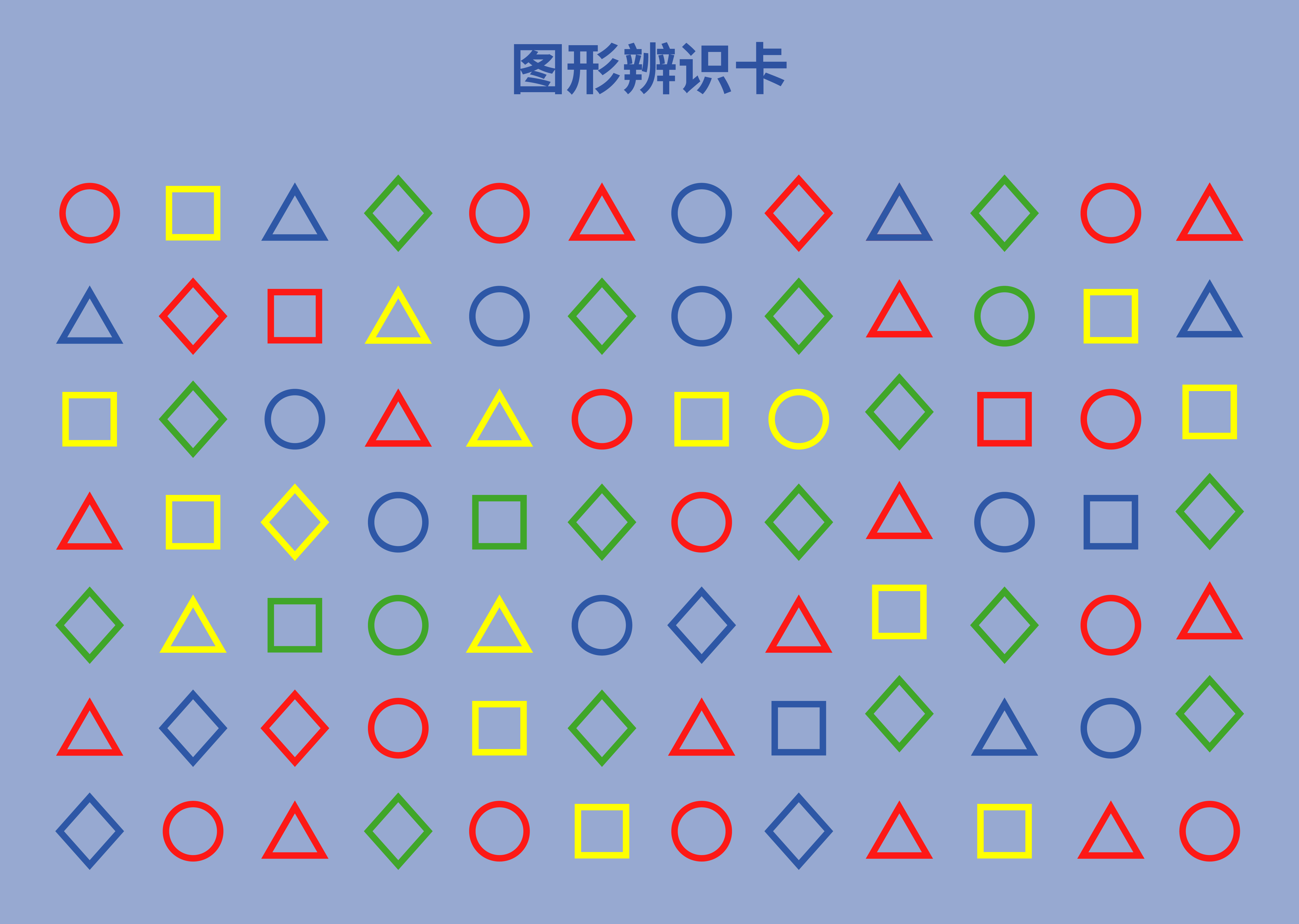 圖形辨識卡是一張訓(xùn)練卡,7行12列,上面分別以圓形、三角形、正方形、菱形,四種圖形呈現(xiàn)。它的游戲規(guī)則是當(dāng)遇到圓形時(shí)拍手1下,當(dāng)遇到正方形時(shí)拍桌子1下,當(dāng)遇到三角形時(shí)拍腿1下,當(dāng)遇到菱形時(shí)連拍手2下,訓(xùn)練循序漸進(jìn)展開,直到老年人能獨(dú)立完成整套訓(xùn)練卡游戲。通過圖形辨識卡,能有效鍛煉老人的手指靈活性,提升老人的空間感和反應(yīng)力,鍛煉大腦活力和認(rèn)知水平。