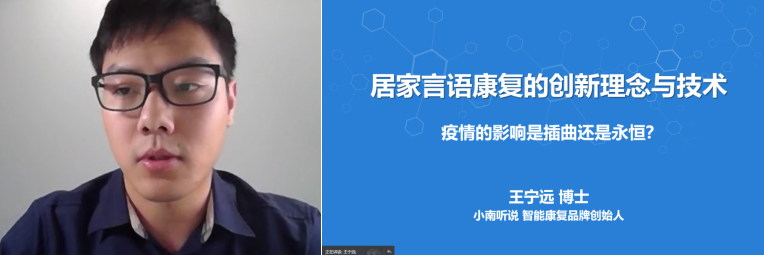 “小南聽說”智能康復(fù)品牌創(chuàng)始人、畢業(yè)于美國明尼蘇達(dá)大學(xué)認(rèn)知與腦科學(xué)專業(yè)的王寧遠(yuǎn)博士結(jié)合了近年來的技術(shù)發(fā)展,與參會人員探討了“創(chuàng)新居家言語康復(fù)的理念與技術(shù)--疫情的影響是插曲還是永恒?”這樣一個話題。在新技術(shù)的加持下,遠(yuǎn)程康復(fù)與居家康復(fù)將會成為傳統(tǒng)線下康復(fù)模式的必要補(bǔ)充。
