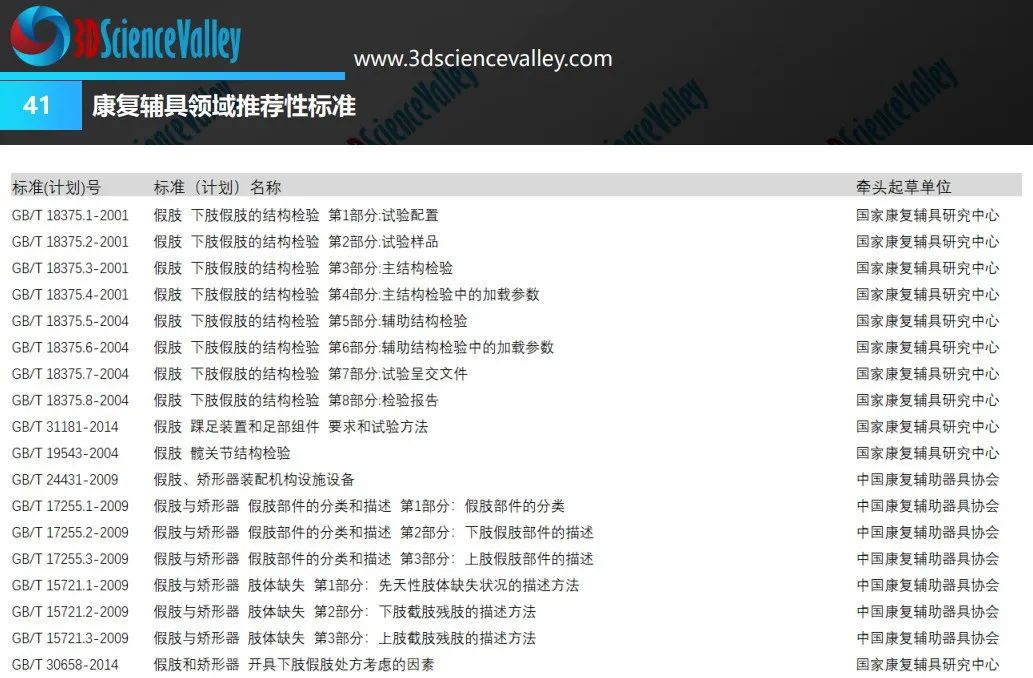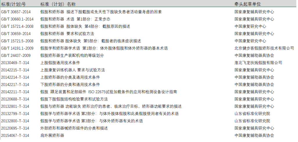 為了規(guī)范康復(fù)輔具領(lǐng)域的研發(fā)與應(yīng)用,國家康復(fù)輔具研究中心、中國康復(fù)輔助器具協(xié)會(huì)等單位牽頭起草了一系列假肢、矯形器、康復(fù)機(jī)器人等產(chǎn)品的推薦性標(biāo)準(zhǔn),以下標(biāo)準(zhǔn)清單可供參考: