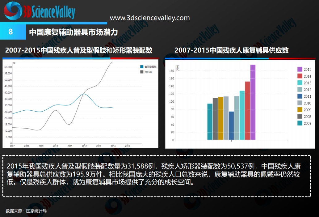 國家統(tǒng)計(jì)局?jǐn)?shù)據(jù)顯示,2018年我國患有各種慢性病的老人有1.5億人,占老年總?cè)藬?shù)的65%;失能、半失能老年人達(dá)4400萬人。此外,各類殘疾人約有8500萬人。殘疾人群、老年人群、慢病人群等的康復(fù)醫(yī)療需求的釋放,將進(jìn)一步激發(fā)康復(fù)輔具市場(chǎng)潛力。