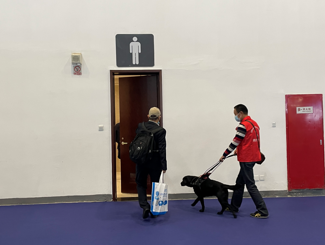 是正在用心工作的導(dǎo)盲犬領(lǐng)著主人去衛(wèi)生間!