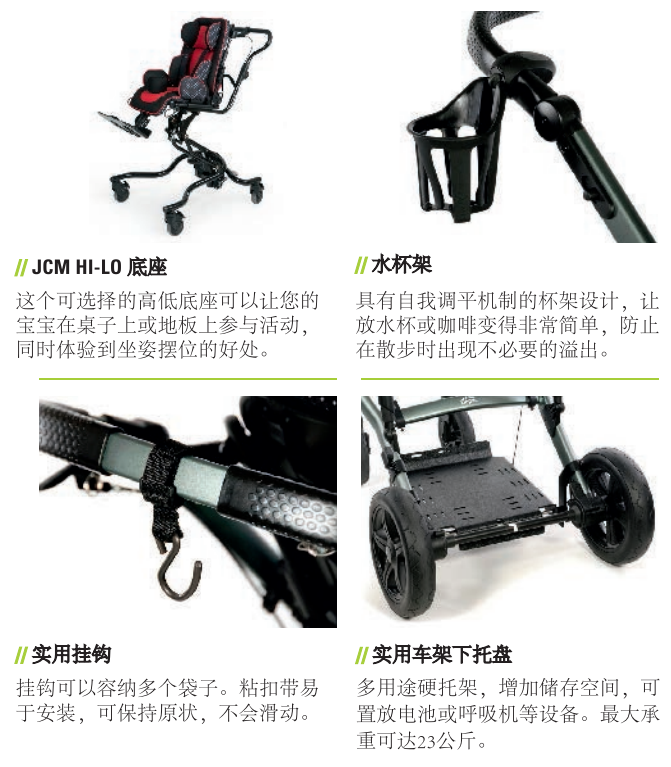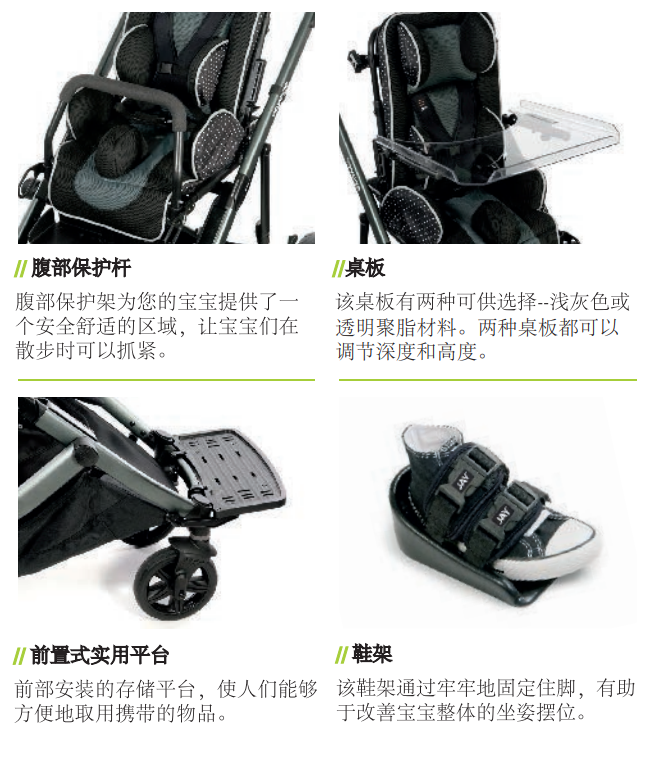 帶網(wǎng)狀窗口的遮蓬、儲(chǔ)物籃、特殊設(shè)計(jì)前輪、腳踏式車輪鎖、角度可調(diào)的嬰兒車把手、前傾設(shè)計(jì)、座椅可向后傾斜 & 躺下、高度和角度可調(diào)的腳踏板、整體傾斜和躺臥調(diào)整。