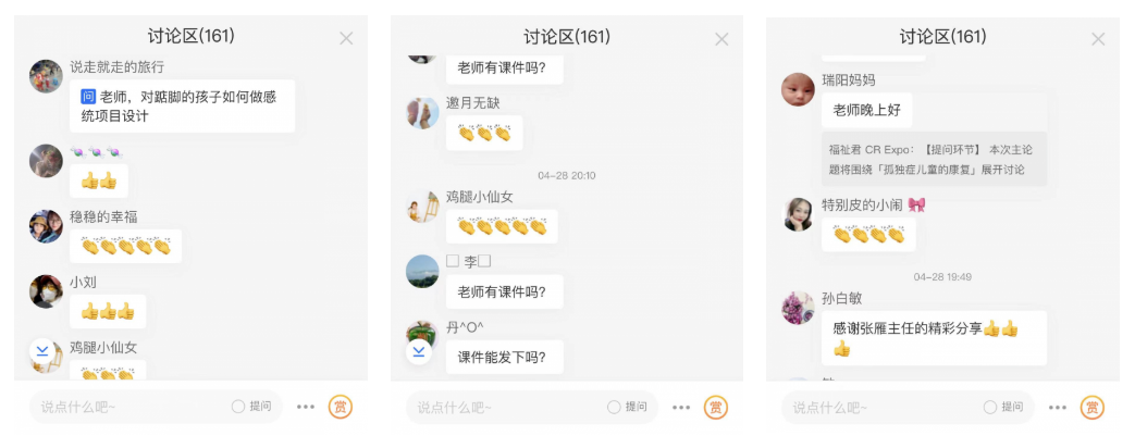 本期直播吸引了來自全國各地的兒童醫(yī)院、婦幼保健院、康復(fù)中心、兒童康復(fù)訓(xùn)練機(jī)構(gòu)、福利院、特殊教育學(xué)校等4000+觀眾在線觀看,互動(dòng)評(píng)論160+,學(xué)習(xí)熱情高漲,反響熱烈。