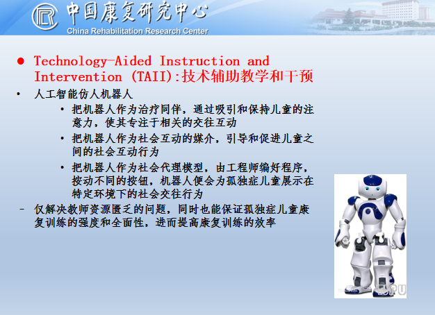 2020年,全美孤獨(dú)癥循證和實(shí)踐審查小組發(fā)表了28種孤獨(dú)癥最新循證治療方法。其中,技術(shù)輔助教學(xué)和干預(yù)作為一種高新輔助技術(shù),值得業(yè)內(nèi)人士關(guān)注。如人工智能仿人機(jī)器人,為孤獨(dú)癥兒童展示在特定環(huán)境下的社會(huì)交往行為 ,解決教師資源匱乏的問題,同時(shí)也能保證孤獨(dú)癥兒童康復(fù)訓(xùn)練的強(qiáng)度和全面性,進(jìn)而提高康復(fù)訓(xùn)練的效率。