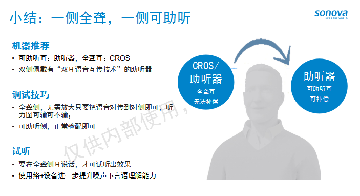 非對稱性聽力損失主要有兩種類型,一種為一側(cè)全聾,一側(cè)可助聽;另一種為雙側(cè)都可助聽但有較好耳。分享會上,孫靜分別為我們介紹了兩種類型的主要解決方案,并提出面對非對稱性聽力損失,不應放棄雙耳驗配,要積極發(fā)揮雙耳語音互傳技術(shù)實現(xiàn)“BICROS”功能。