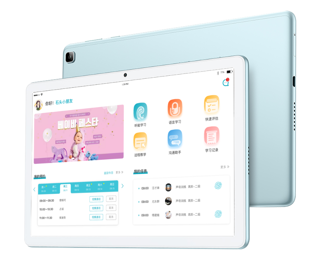 小南聽說集體康復(fù)系統(tǒng)由一臺主機(集體康復(fù)智慧屏)及6臺以上智能康復(fù)終端設(shè)備組成,適用于孤獨癥譜系障礙、言語語言障礙、聽覺障礙認知障礙等兒童的測評及康復(fù)訓(xùn)練。產(chǎn)品以兒童語言康復(fù)學(xué)、應(yīng)用行為分析 (ABA)、0-6歲兒童發(fā)展綱領(lǐng)為設(shè)計原則,基于智慧化評測體系,精準快速定位問題,將康復(fù)進展可視化呈現(xiàn)。同時本產(chǎn)品采用場景化設(shè)計,通過康復(fù)訓(xùn)練、游戲和智慧化康復(fù)管理等模塊,讓患者得到更好的干預(yù)效果。