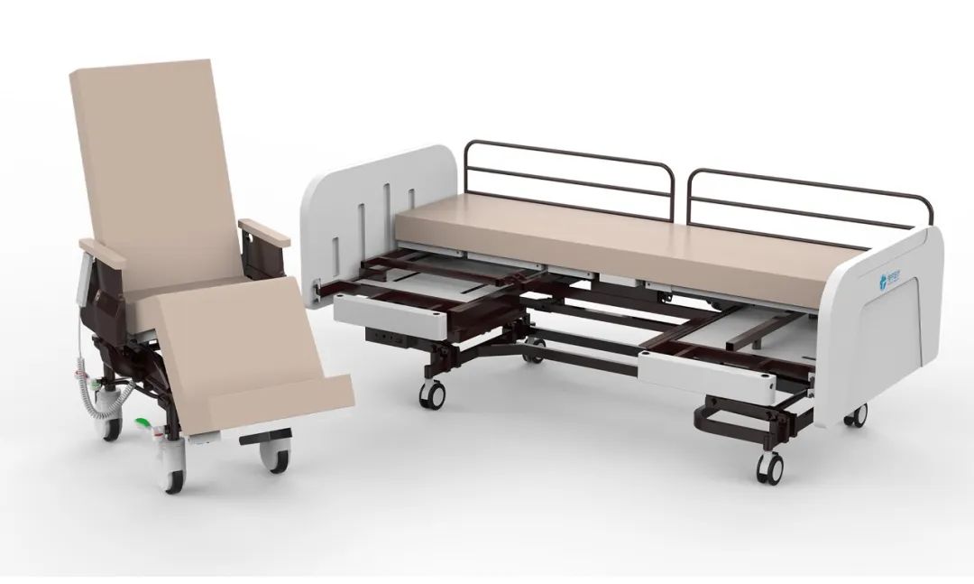 多功能康復(fù)護(hù)理床包括床體部分和輪椅部分,能夠?qū)崿F(xiàn)床體部分與輪椅部分的合體和分離。在合體狀態(tài)下,床體部分和輪椅部分可作為一個(gè)整體,具備一定的護(hù)理功能,能夠?qū)崿F(xiàn)患者的臥姿、起背和曲腿等姿勢(shì)的調(diào)整。在分離狀態(tài)下,患者可由醫(yī)護(hù)人員從床體平移到輪椅上,此時(shí)的輪椅處于展平狀態(tài),患者可躺臥在上面,當(dāng)需要轉(zhuǎn)移患者時(shí),可收合輪椅,使患者處于坐姿狀態(tài)。能夠通過合體或分離實(shí)現(xiàn)患者的自由轉(zhuǎn)移。