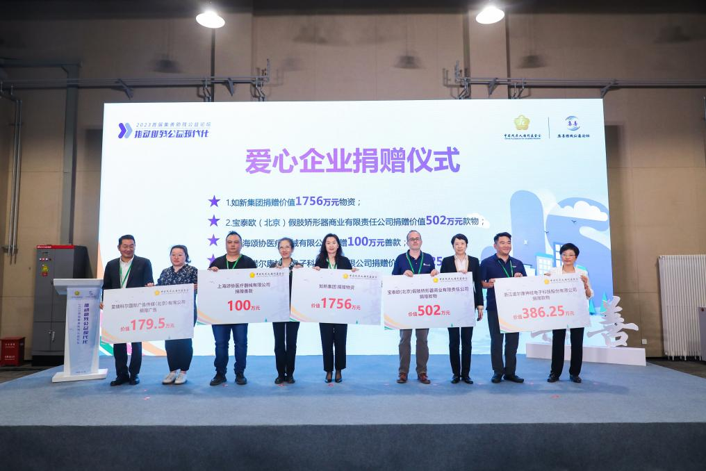 (上三圖為可孚醫(yī)療科技股份有限公司、新矩基金會、深圳美麗魔方健康投資集團、浙江螞蟻公益基金會、正保遠程教育、寶泰歐(北京)假肢矯形器商業(yè)有限責(zé)任公司、上海頌協(xié)醫(yī)療器械有限公司、如新集團、浙江諾爾康神經(jīng)電子科技股份有限公司、亞瑞科爾國際廣告?zhèn)髅剑ū本┯邢薰?、大王(南通)生活用品有限公司、杭州愛聽科技有限公司、明門(中國)幼童用品有限公司、唐山市福愛假肢矯形器有限公司、北京創(chuàng)潔衛(wèi)康科技有限公司等15家愛心企業(yè)和機構(gòu)向中國殘疾人福利基金會捐贈了總價值1.07億元的款物)